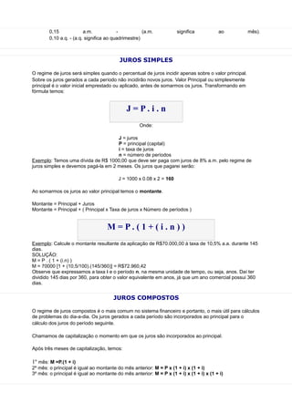 O documento apresenta conceitos básicos de Matemática Financeira, incluindo definições de capital, juros, taxas de juros, juros simples e compostos. Explica que juros simples incidem apenas sobre o capital inicial, enquanto juros compostos incidem sobre o capital acumulado a cada período. A maioria das operações financeiras usa juros compostos.