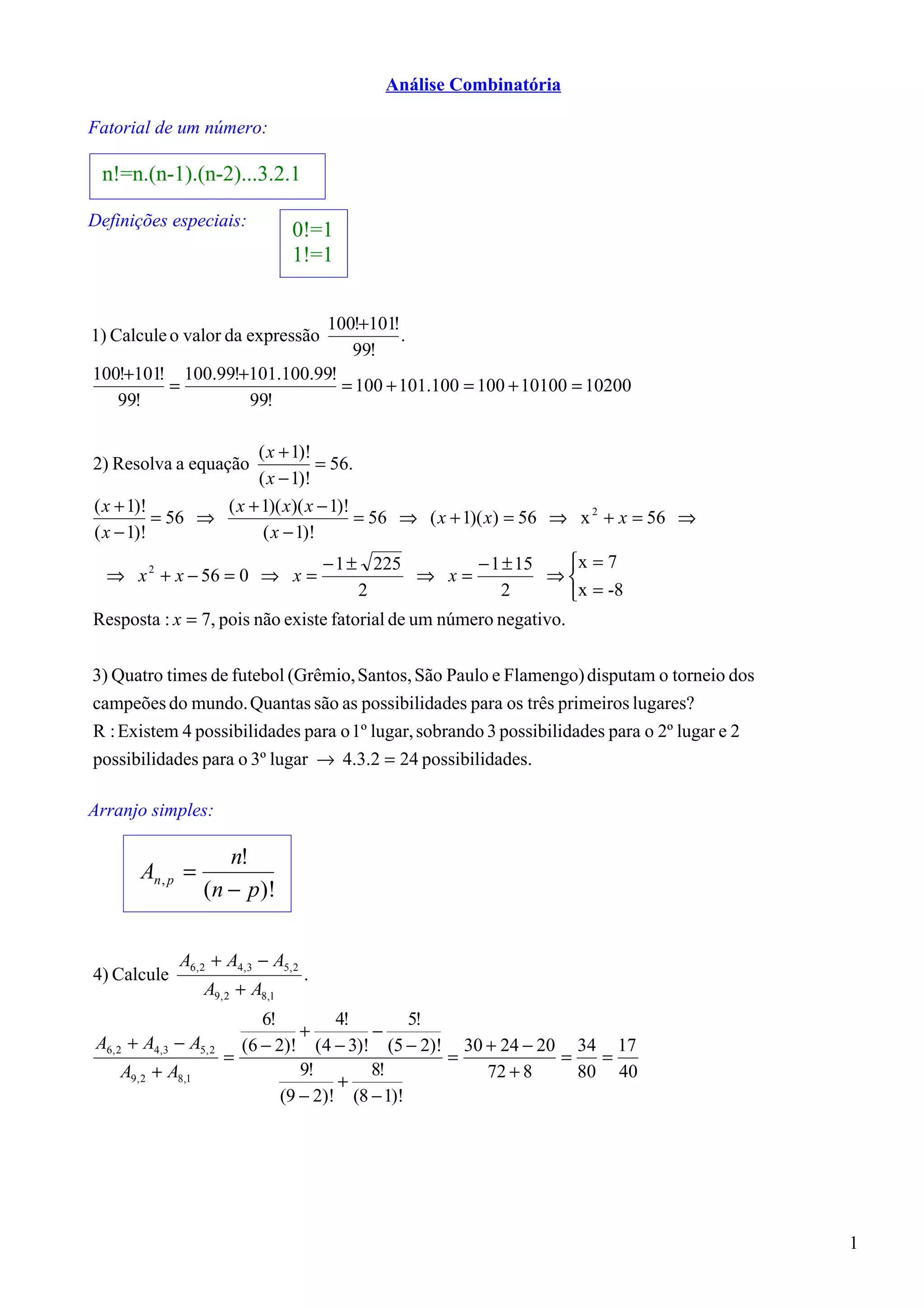1. O documento apresenta fórmulas e definições de conceitos fundamentais de combinatória e probabilidade como fatorial, arranjo simples, permutação simples e combinação simples.