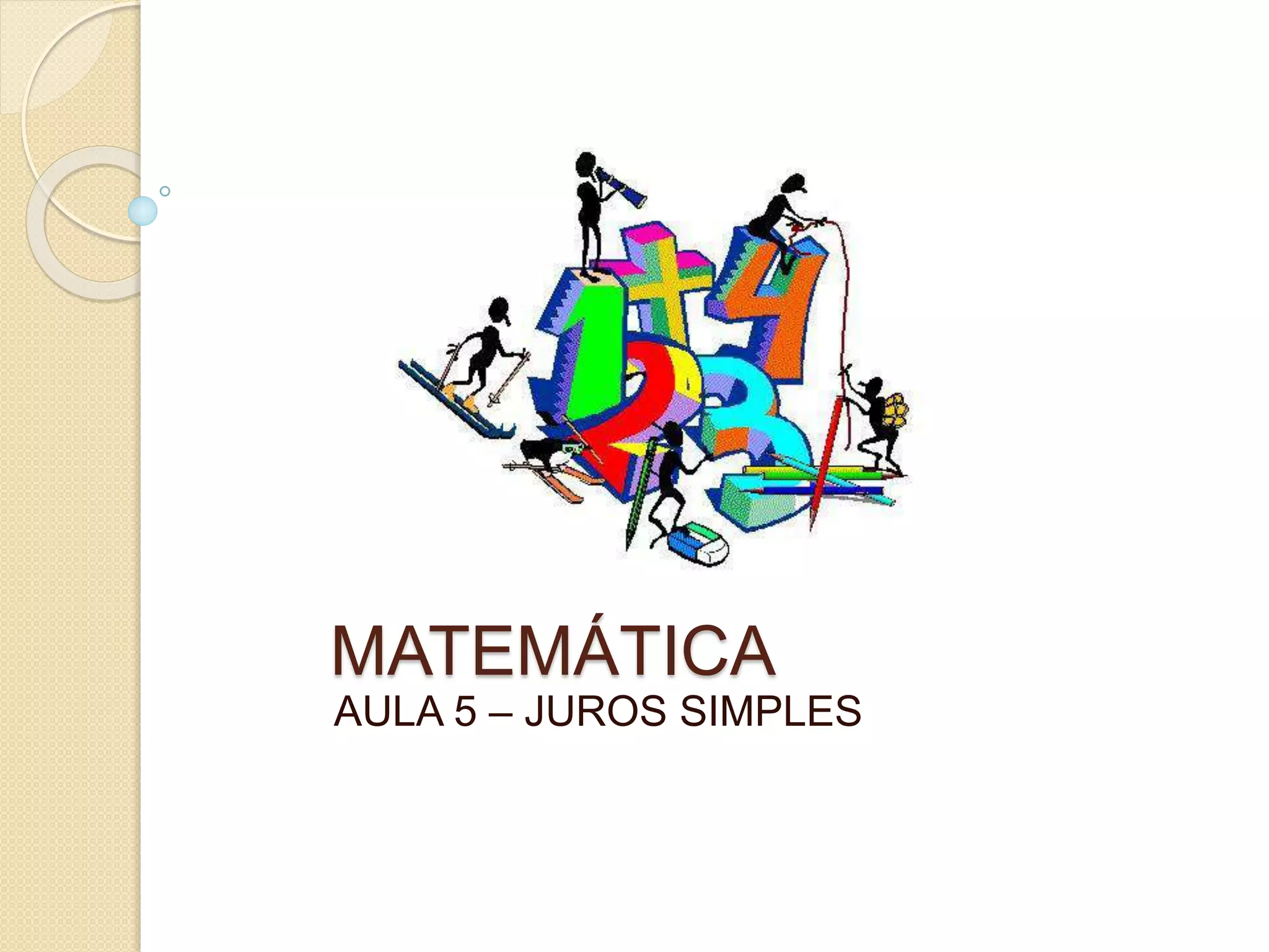O documento apresenta os conceitos básicos de juros simples, definindo-o como o regime em que os juros incidem apenas sobre o capital inicial, sem compor juros sobre juros. Apresenta a fórmula para cálculo de juros simples e exemplos ilustrativos, incluindo cálculos de montante, taxa de juros e tempo de aplicação.