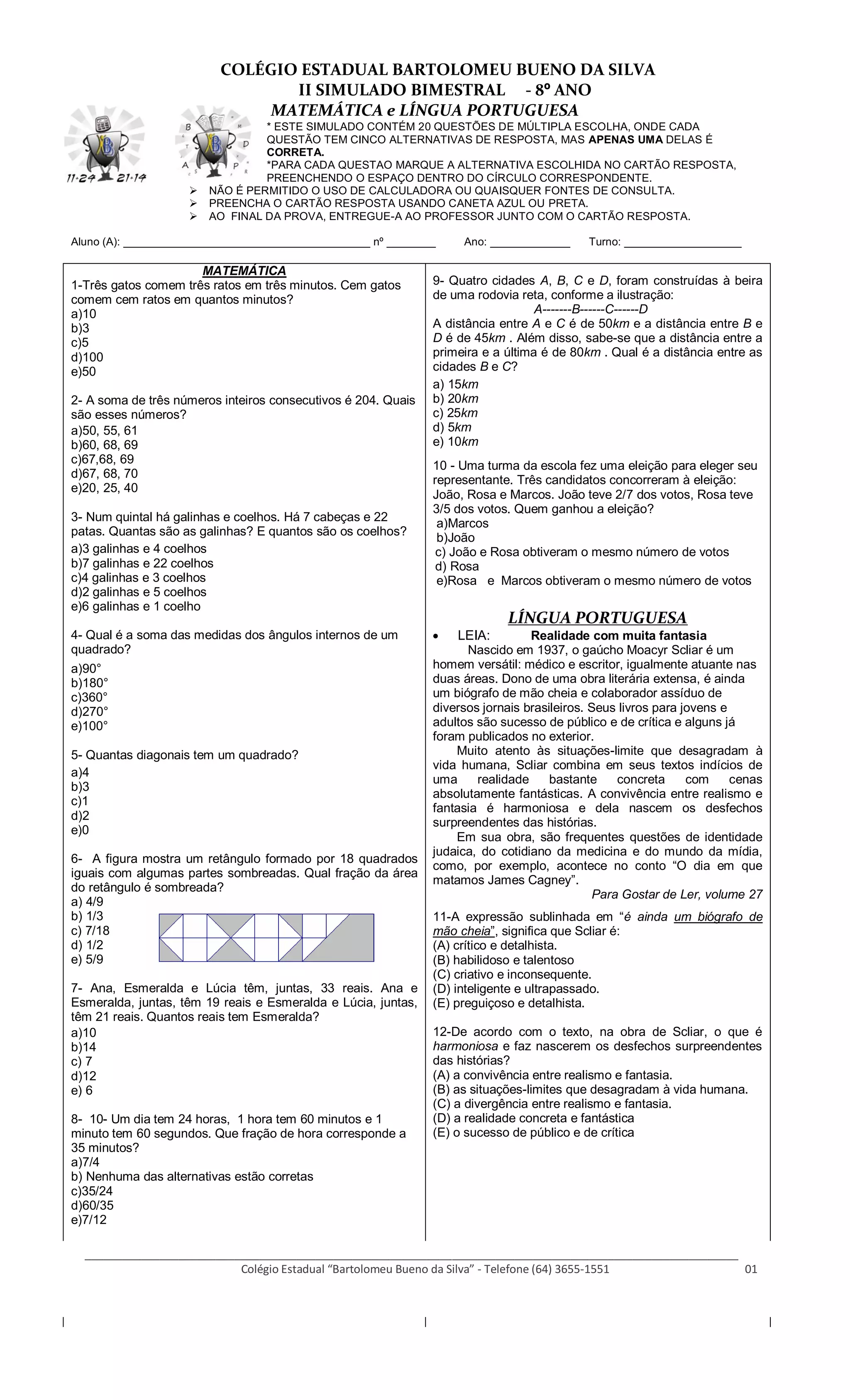 Este documento descreve um simulado bimestral para os alunos do 8o ano do Colégio Estadual Bartolomeu Bueno da Silva, contendo 20 questões de múltipla escolha sobre Matemática e Língua Portuguesa. As instruções incluem não usar calculadora ou consultas, preencher o cartão de respostas com caneta azul ou preta e entregar ao professor ao final.