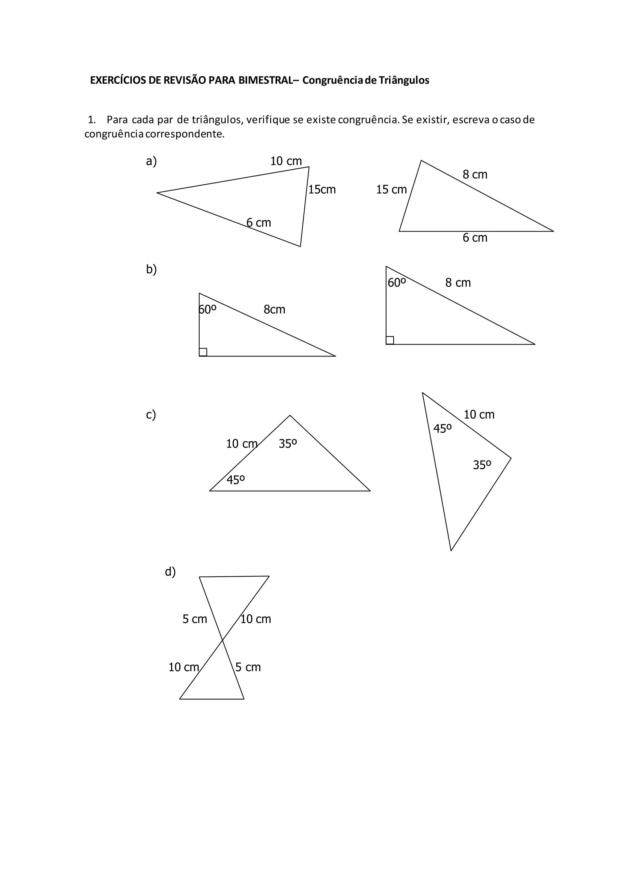 2. Nos exercícios, deve-se verificar se triângulos dados são congruentes de acordo com seus lados e ângulos, calcular medidas desconhecidas e identificar afirmações verdadeiras.