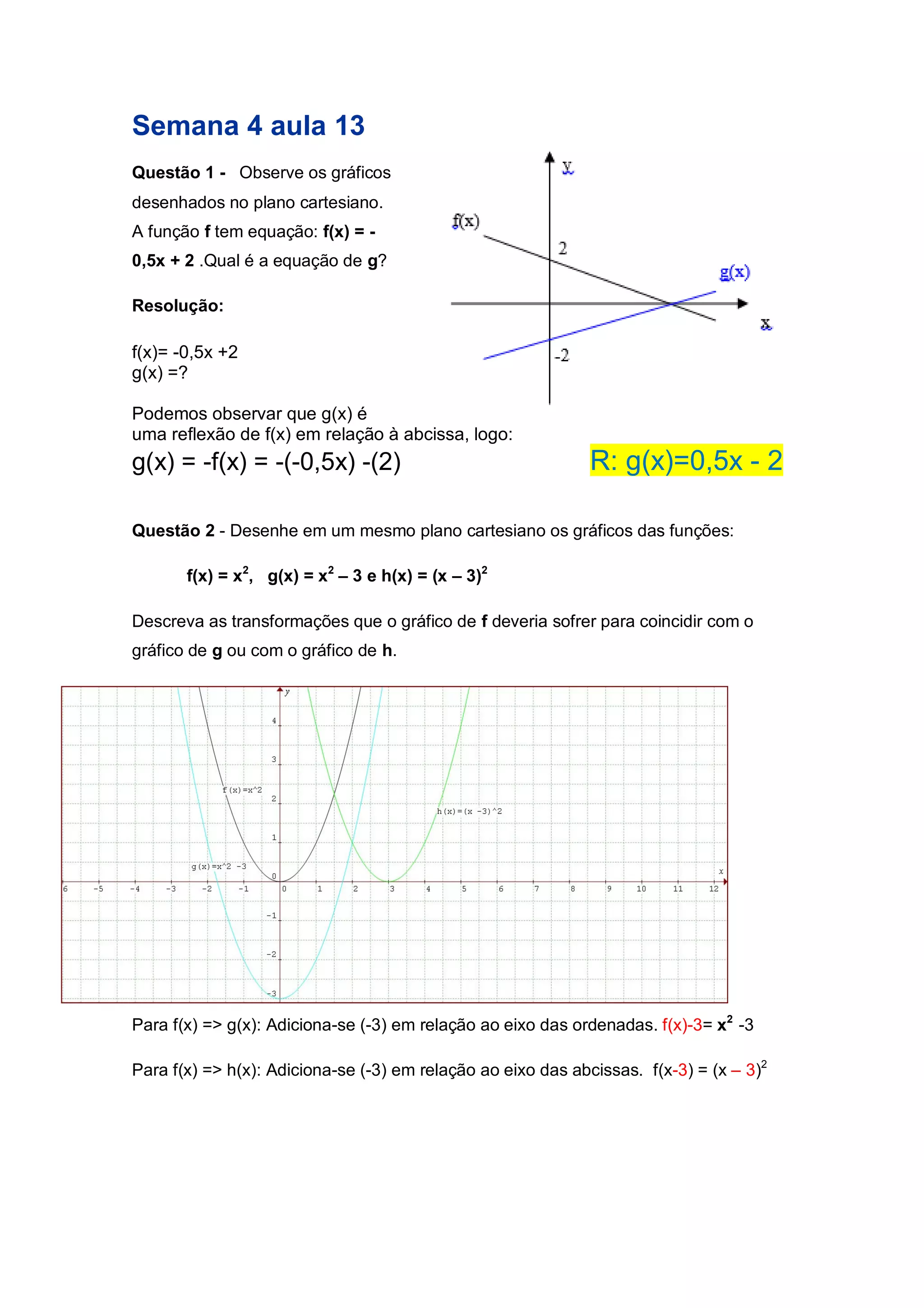Este documento apresenta duas aulas sobre funções quadráticas. A primeira aula discute reflexões e translações de gráficos de funções. A segunda aula explora como translações podem ser usadas para fazer um gráfico de função coincidir com outro.