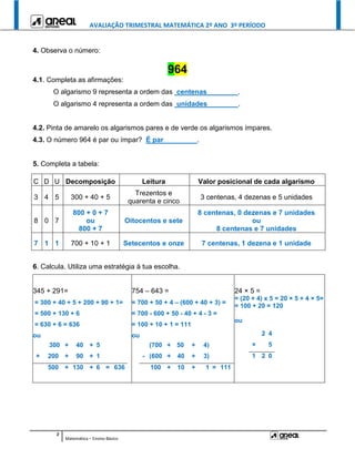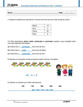 Este documento contém uma avaliação trimestral de matemática para o 2o ano do 3o período. A avaliação inclui vários exercícios sobre números, operações matemáticas, geometria, medição, estatística e resolução de problemas. Os alunos devem demonstrar suas habilidades em interpretar tabelas, completar expressões, ordenar números, realizar cálculos, identificar medidas, preencher gráficos e desenhar figuras geométricas.