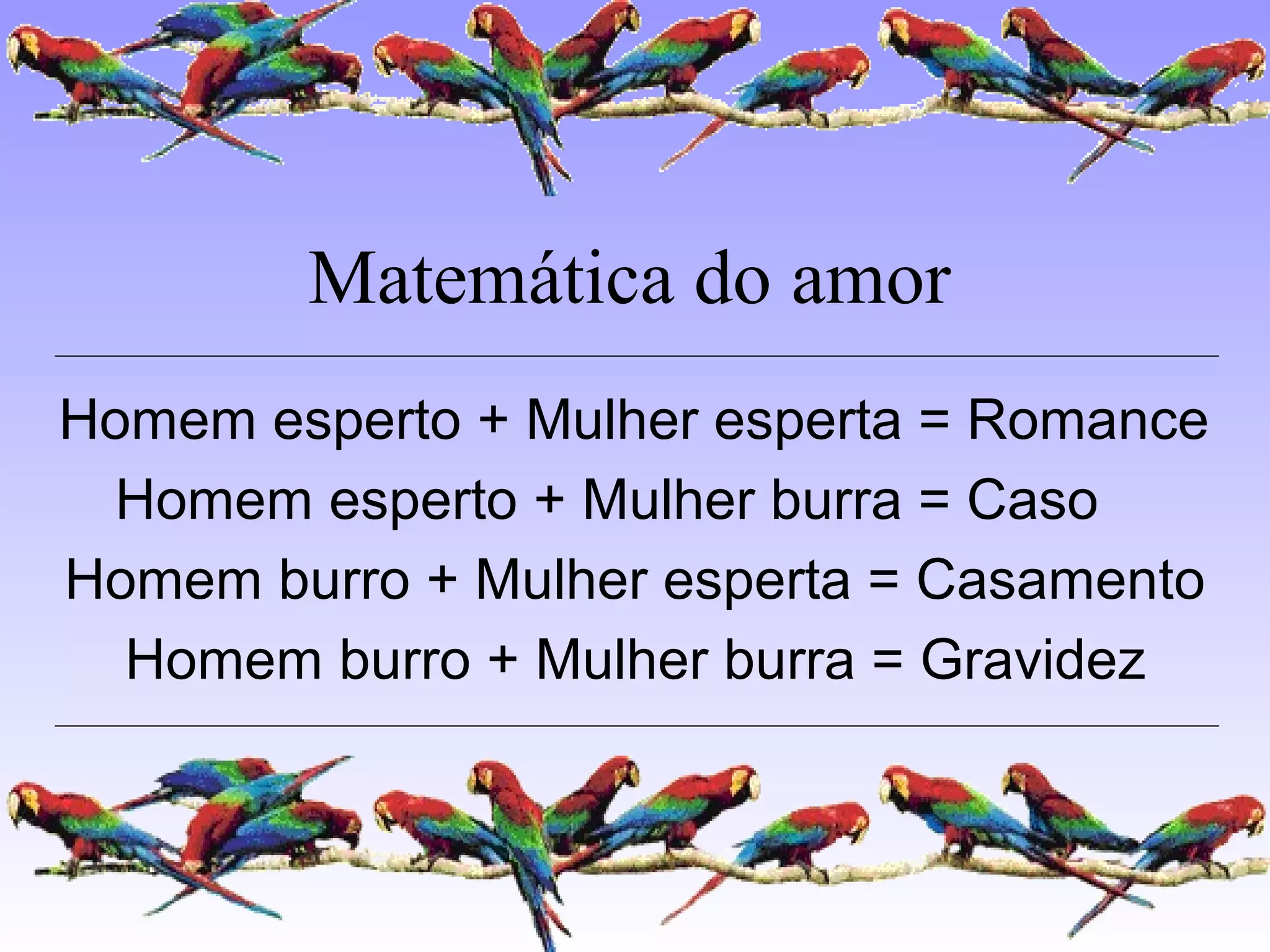 O documento apresenta várias equações e observações humorísticas sobre relacionamentos entre homens e mulheres, amor, casamento e dinâmica de gênero, sugerindo que as personalidades e ações dos indivíduos de cada gênero podem ser preditas ou generalizadas de acordo com estereótipos.