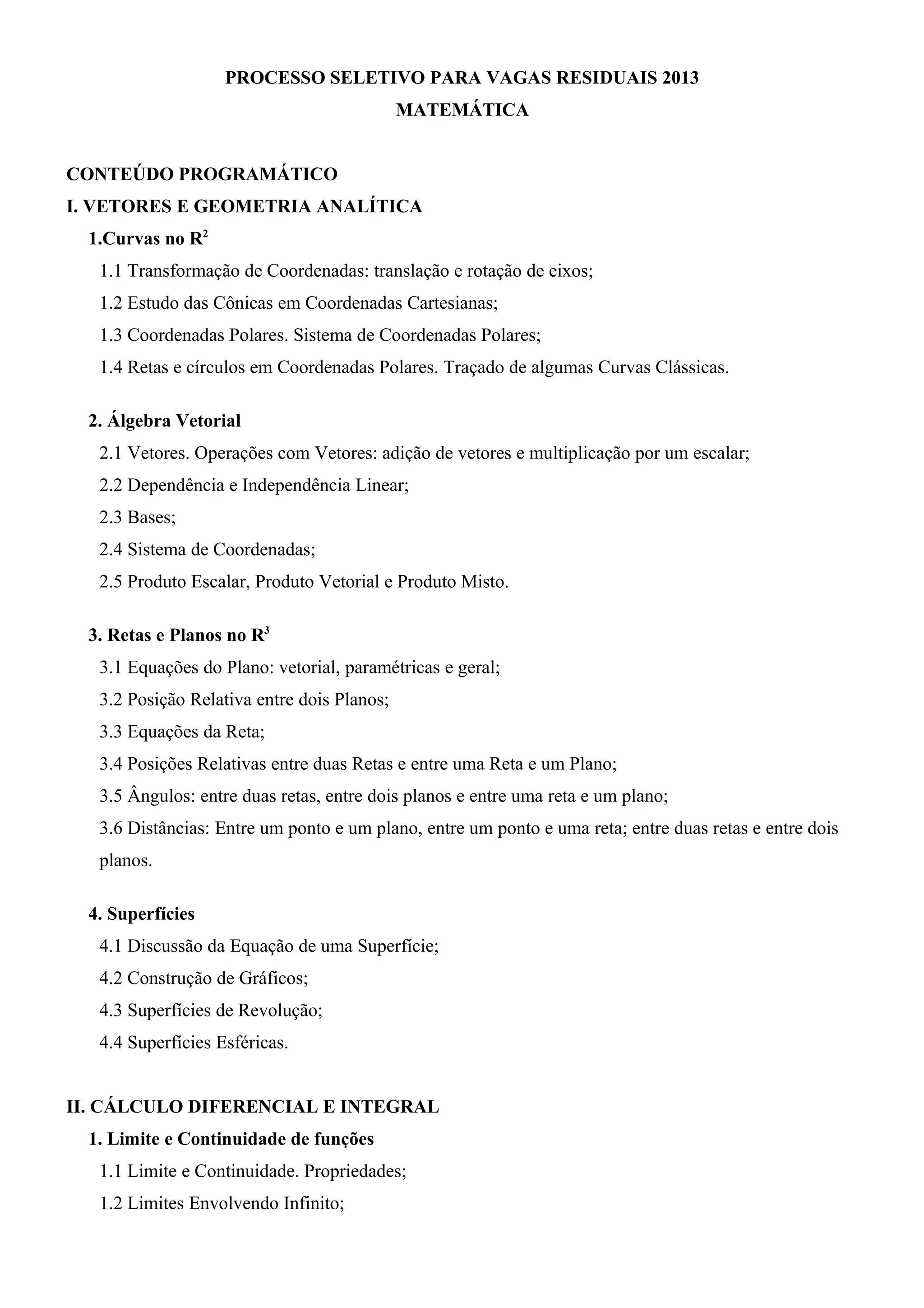 O documento apresenta o conteúdo programático para o processo seletivo de vagas residuais de 2013 em Matemática, abrangendo os tópicos de Vetores e Geometria Analítica, e Cálculo Diferencial e Integral, com ênfase em curvas no plano e no espaço, álgebra vetorial, derivadas, integrais indefinidas e definidas, funções de várias variáveis e integral dupla. A bibliografia recomendada inclui vários livros sobre esses assuntos.