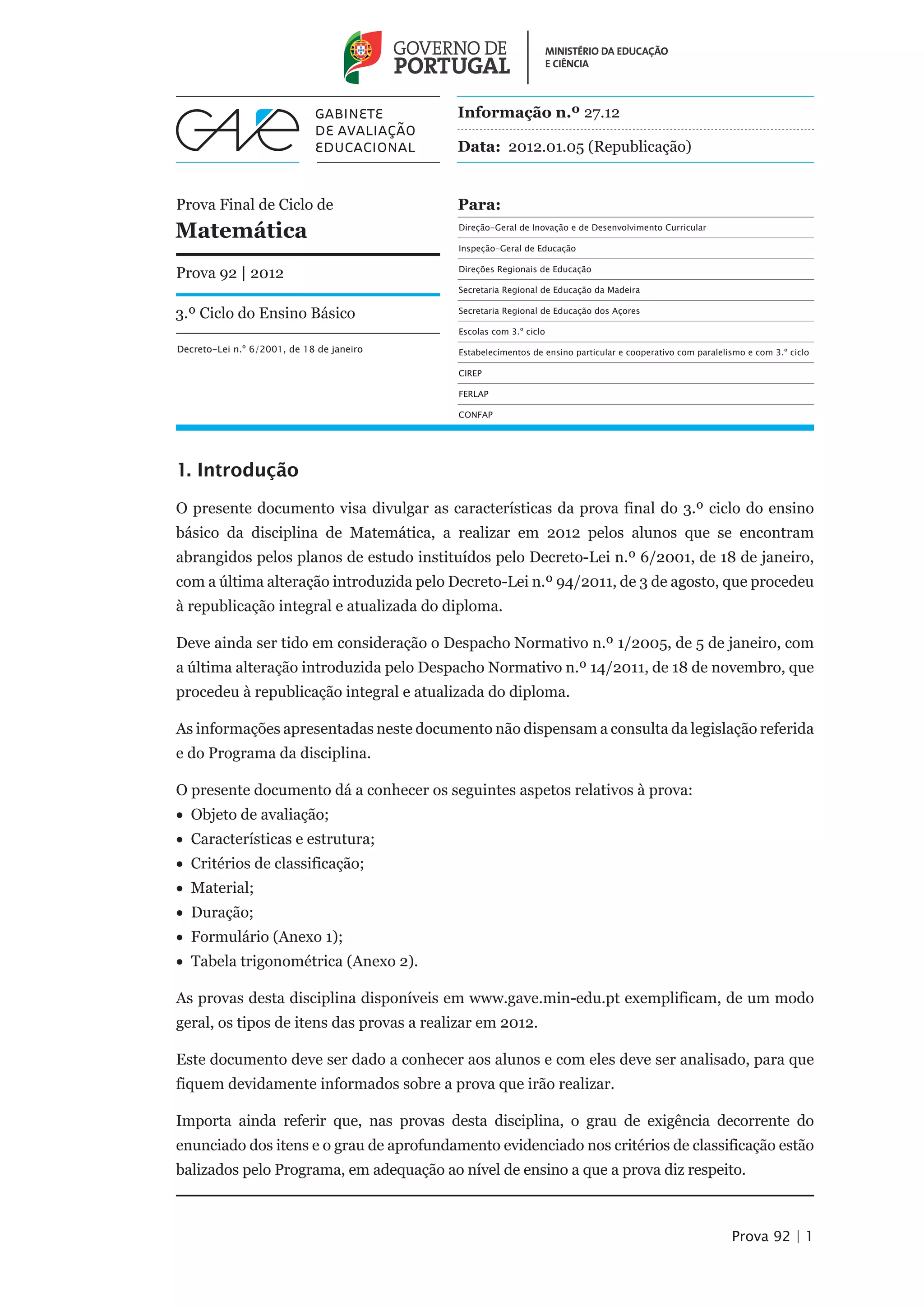 Este documento fornece informações sobre a prova final de Matemática do 3o ciclo do ensino básico em 2012, incluindo os objetivos de avaliação, estrutura e tipos de itens da prova, critérios de classificação e material permitido.