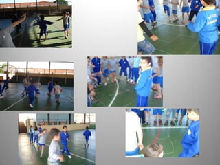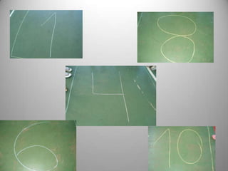 Este documento descreve dois jogos matemáticos para crianças do 1o ano: 1) Jogando com Números, onde as crianças saltam em volta de números desenhados no chão e se posicionam quando a música para; 2) Esvaziando o Prato, onde as crianças tiram e colocam botões de pratos de acordo com o número no dado. O objetivo é trabalhar noções de quantidade, contagem e operações matemáticas básicas de uma maneira lúdica e envolvendo movimento corporal.