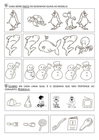 O documento fornece instruções para completar séries de desenhos, identificar itens que não pertencem a um conjunto e circundá-los, e pintar ovos de Páscoa e maçãs de acordo com modelos ou instruções.
