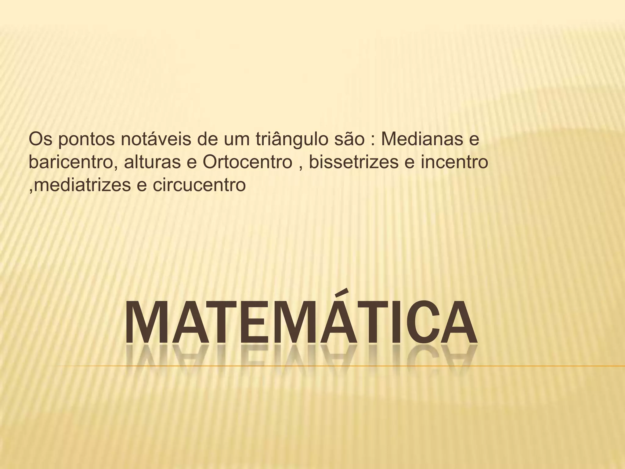 O documento discute pontos notáveis em triângulos, incluindo medianas e baricentro, alturas e ortocentro, bissetrizes e incentro, e mediatrizes e circucentro. As medianas de um triângulo conectam cada vértice ao ponto médio do lado oposto, e os três pontos de interseção das medianas definem o baricentro do triângulo.