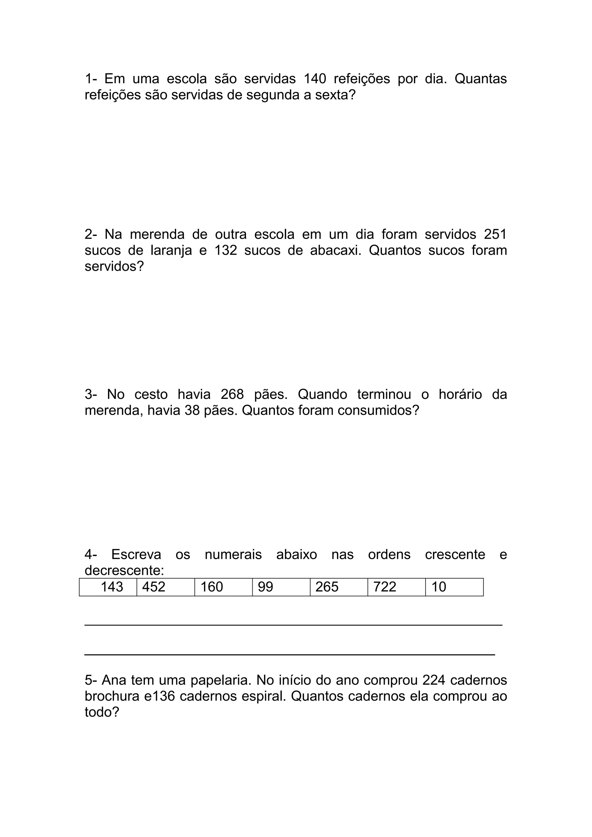 1) O documento contém 15 problemas matemáticos envolvendo adição, subtração, multiplicação e comparação de números. 2) Os problemas incluem cálculos sobre refeições servidas em escolas, sucos consumidos, pães restantes, ordenação de números, soma de cadernos comprados e lápis produzidos. 3) São também abordados cálculos envolvendo figurinhas colecionadas, balas ganhas, comparação de quantidades e resolução de problemas com números desconhecidos.