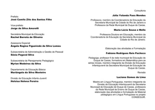 1) O documento apresenta a equipe responsável pelo projeto CONSEGUIR da Secretaria Municipal de Educação de Duque de Caxias, incluindo professores e assessores.