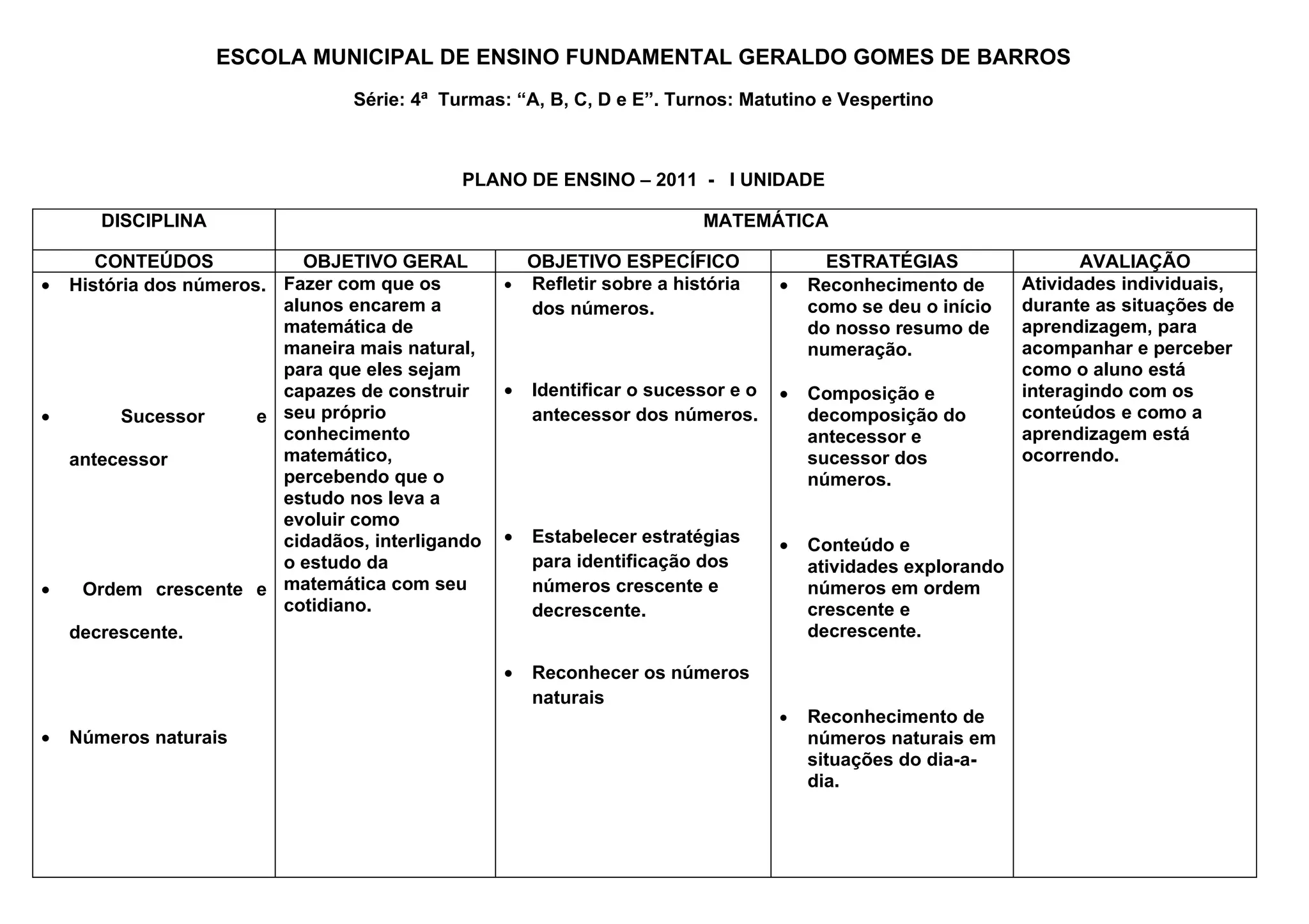 O documento apresenta o plano de ensino de matemática para alunos da 4a série de uma escola municipal. Contém os conteúdos, objetivos gerais e específicos, estratégias de ensino e avaliação para quatro unidades didáticas sobre números naturais, operações matemáticas, sistemas de medidas e expressões numéricas.