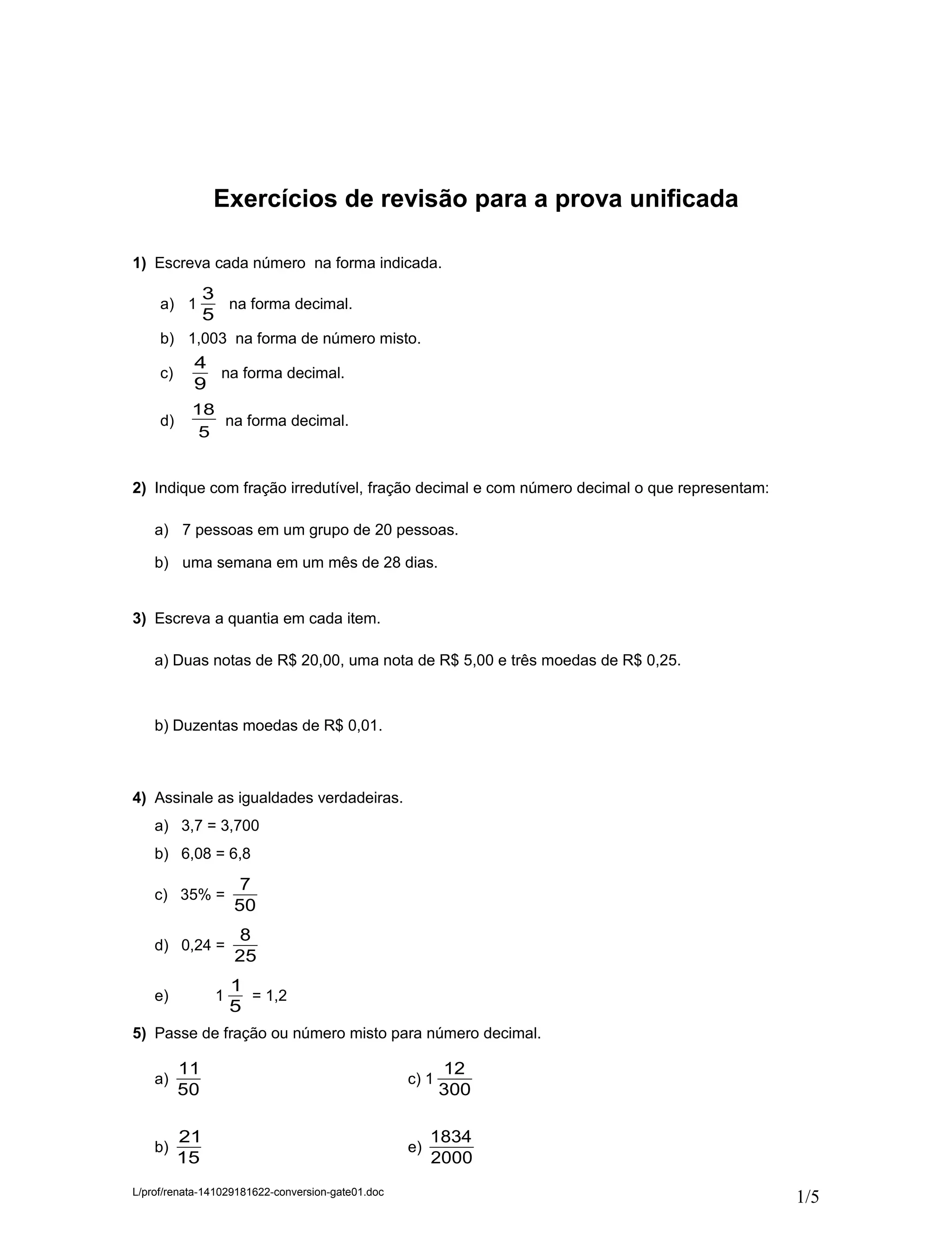 1) O documento contém 19 exercícios de matemática sobre conversão entre diferentes representações numéricas como frações, decimais e porcentagens.