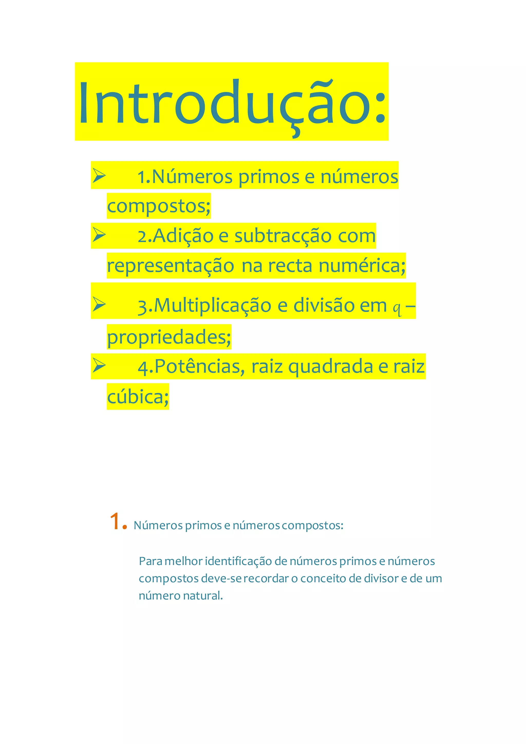 O documento aborda conceitos fundamentais de números primos e compostos, destacando suas definições e propriedades, incluindo a decomposição em fatores primos. Também discute operações básicas como adição, subtração, multiplicação e divisão de números racionais, apresentando regras e propriedades associadas. Além disso, menciona o máximo divisor comum (m.d.c) e o mínimo múltiplo comum (m.m.c), bem como a representação de números na reta numérica.