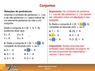 O documento discute conjuntos e operações entre conjuntos. Explica como representar conjuntos por enumeração de elementos ou propriedades, relações de pertinência e inclusão, operações como união, intersecção e diferença, conjuntos complementares e o conjunto de partes de um conjunto.