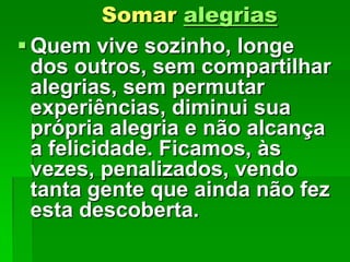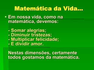 O documento discute como a matemática pode ser aplicada à vida para trazer felicidade. Sugere somar alegrias compartilhando com os outros, diminuir tristezas ajudando os outros, multiplicar felicidade plantando-a com os outros, e dividir o amor que acaba por multiplicá-lo. Conclui que seguir esses princípios trará a alegria de viver.