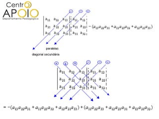 O documento aborda o conceito de determinantes de matrizes, incluindo definições, representações e métodos de cálculo para matrizes de diferentes ordens. Ele explora propriedades importantes dos determinantes e apresenta teoremas relacionados, como o teorema de Binet e o teorema de La Place, com exemplos práticos. Os conteúdos são apoiados por bibliografia relevante e sugestões de exercícios para prática.