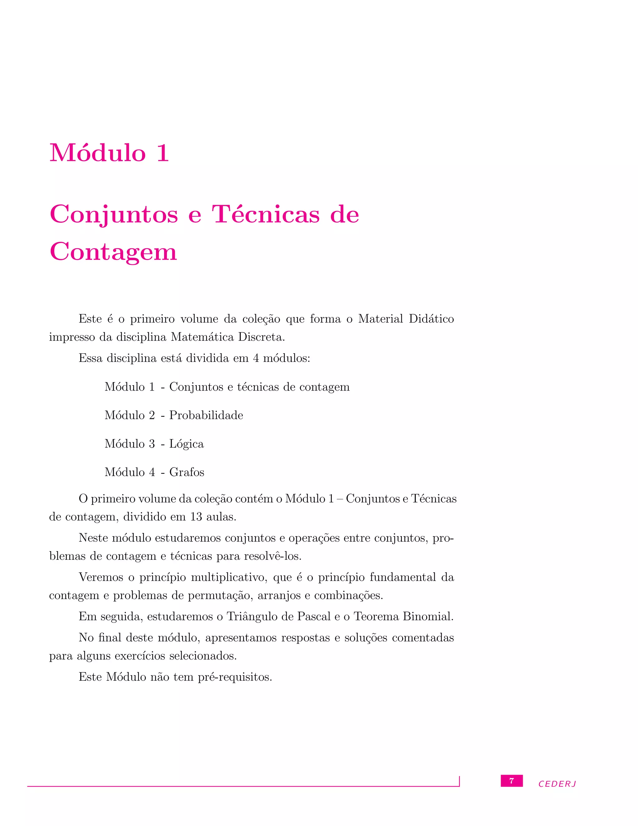 Este documento descreve o primeiro módulo de uma disciplina de Matemática Discreta. O módulo 1 trata de Conjuntos e Técnicas de Contagem, dividido em 13 aulas, e aborda conjuntos, operações entre conjuntos, problemas de contagem e técnicas para resolvê-los como o princípio multiplicativo.