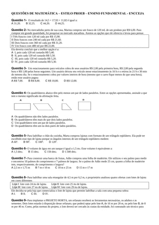 O documento contém 23 questões de múltipla escolha sobre assuntos como matemática, geometria, porcentagem e interpretação de gráficos e tabelas. As questões abordam tópicos como cálculo, medidas, tarifas, juros e estatística aplicados a situações do cotidiano.