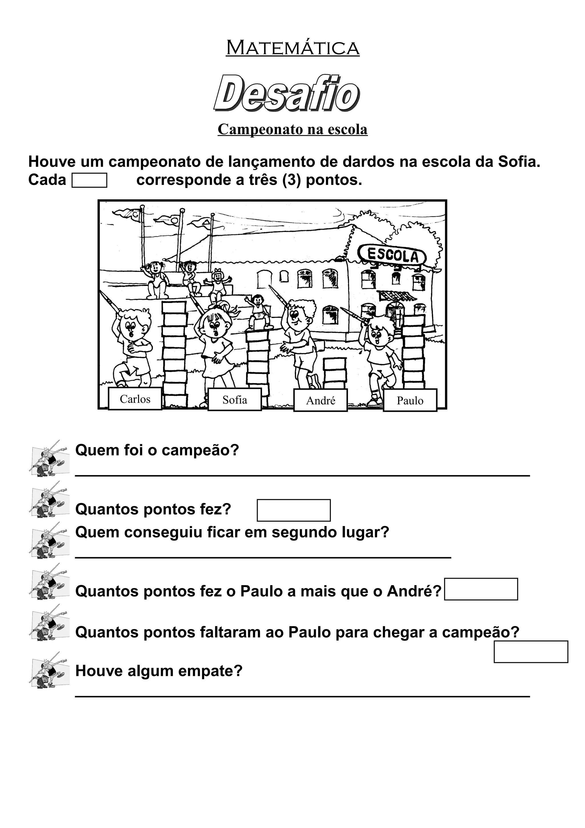 O documento descreve um campeonato de lançamento de dardos na escola da Sofia. O Carlos foi o campeão e o André ficou em segundo lugar. Faltaram 3 pontos para o Paulo empatar com o campeão.