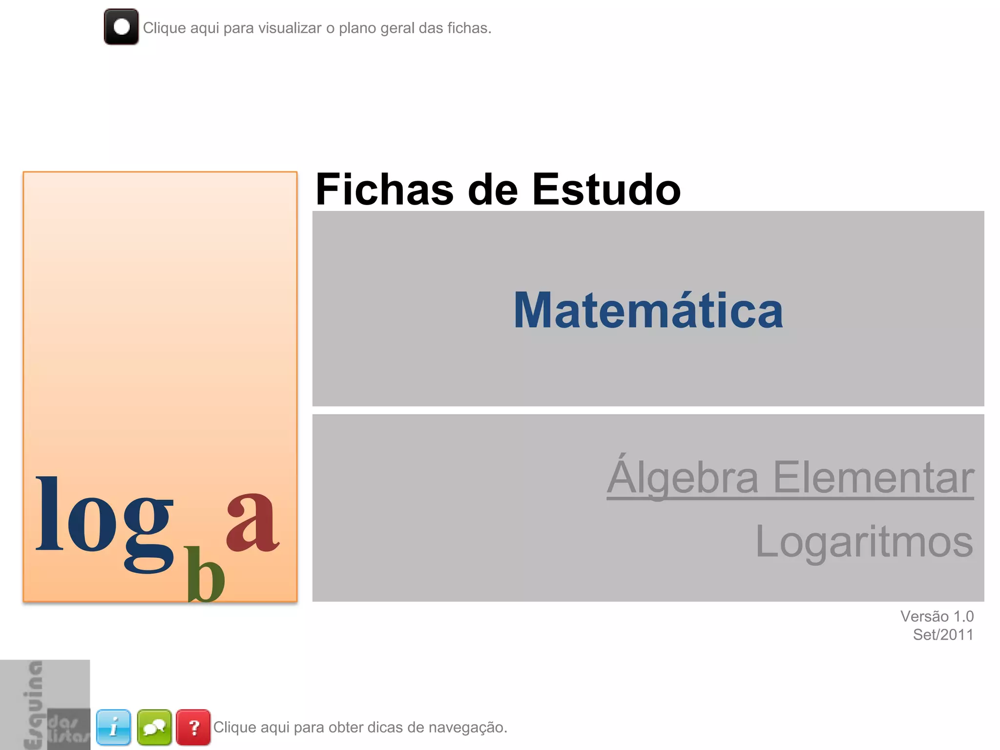 Este documento fornece um plano geral de 5 fichas sobre logaritmos na álgebra elementar. A primeira ficha define logaritmos e estabelece suas condições de existência, a segunda cobre as consequências da definição, e a terceira trata das propriedades dos logaritmos.