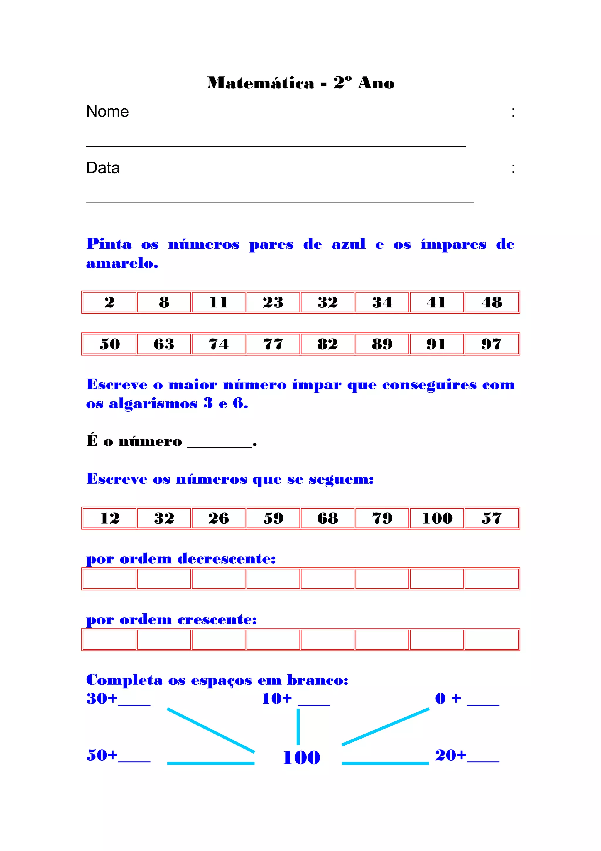 Este documento contém um conjunto de exercícios matemáticos para alunos do 2o ano. Inclui tarefas como pintar números pares e ímpares, encontrar o maior número ímpar com algarismos específicos, ordenar números, completar equações, identificar valores de algarismos em números, comparar números usando sinais, preencher um quadro numérico e resolver problemas de adição e subtração envolvendo números de flores e dinheiro.