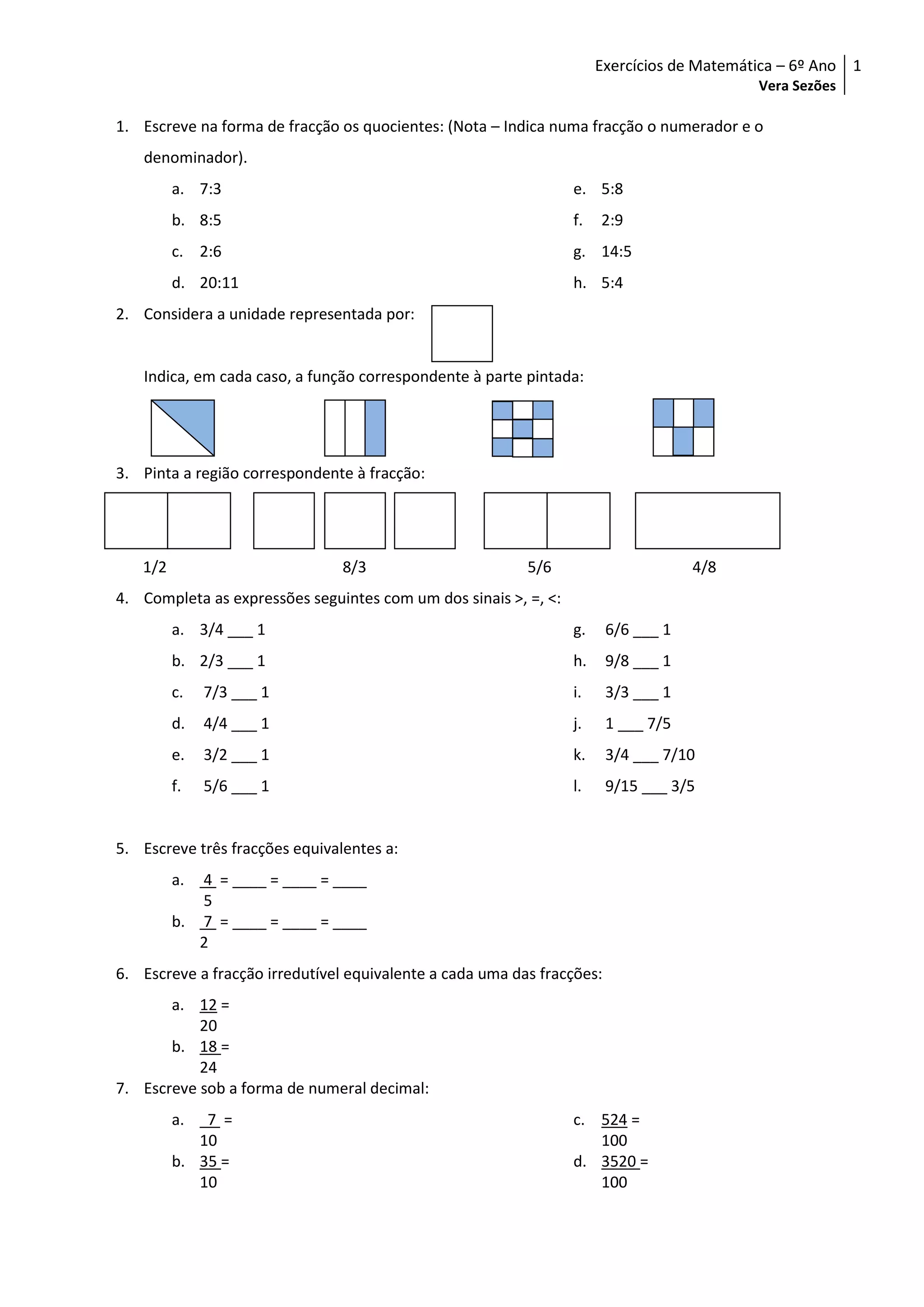 1) O documento apresenta vários exercícios matemáticos relacionados com frações, incluindo representar frações como numerais decimais, calcular operações com frações e resolver problemas.