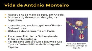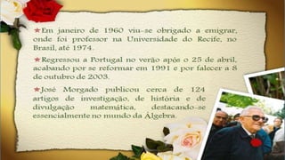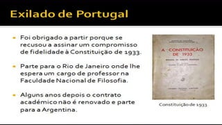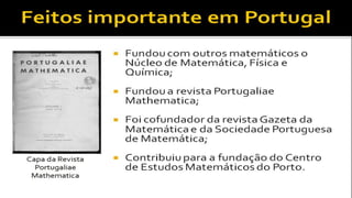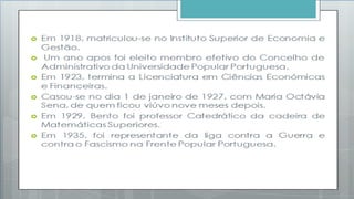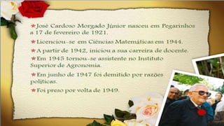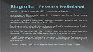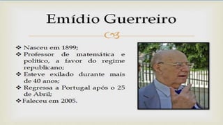 O documento apresenta breves biografias de diversas personalidades portuguesas, destacando suas formações acadêmicas, exílios, perseguições políticas e contribuições ao campo da ciência e literatura. Várias dessas figuras foram impactadas pela ditadura salazarista, o que levou à demissão, prisão ou exílio. Entre os mencionados, há matemáticos, físicos, escritores, e educadores, cujas vidas se entrelaçam com eventos históricos significativos em Portugal.