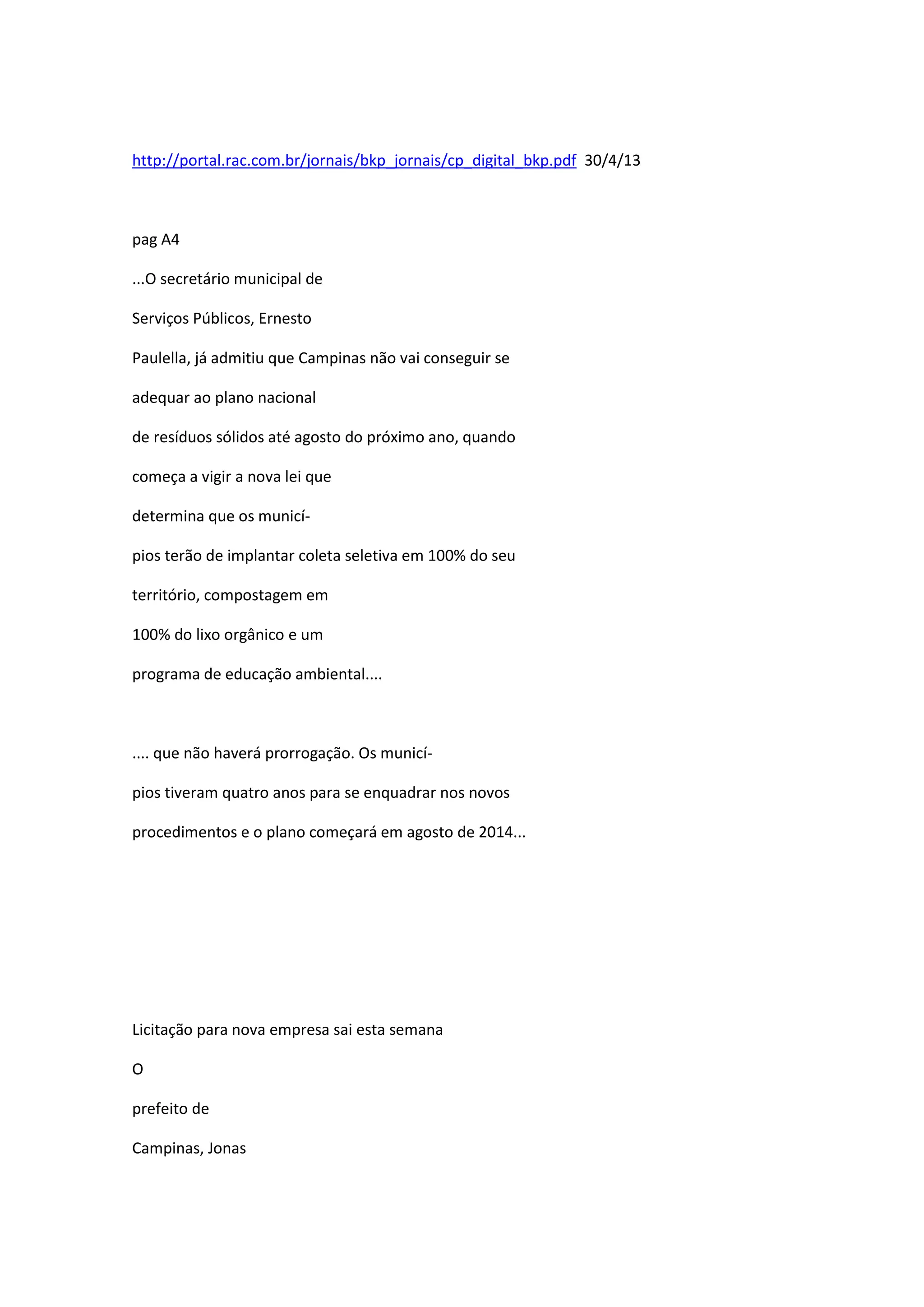 O secretário municipal de serviços públicos de Campinas admitiu que o município não conseguirá cumprir a lei nacional de resíduos sólidos até agosto de 2014. O prefeito de Campinas autorizou a publicação de um novo edital para contratar uma empresa para a coleta e operação do aterro por 1 ano enquanto uma parceria público-privada é estruturada. O edital anterior no valor de R$400 milhões foi anulado pelo Tribunal de Contas por impedir a participação de pequenas empresas.