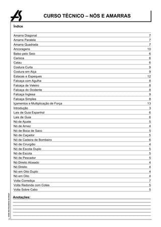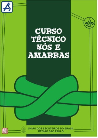 Este documento apresenta diversos nós, amarras e técnicas utilizadas em atividades de escotismo, como acampamento. Inicia descrevendo características gerais de um bom nó e apresenta exemplos de nós simples como o direito e em oito. Também mostra amarras, falcaças e técnicas para içamento e multiplicação de força.