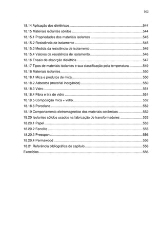 Este capítulo discute materiais dielétricos e suas propriedades. Aborda conceitos como polarização, capacitância e constante dielétrica. Descreve como esses materiais se comportam na presença de um campo elétrico e como suas propriedades dependem de fatores como frequência e temperatura. Também classifica diferentes tipos de materiais dielétricos e suas aplicações comuns.