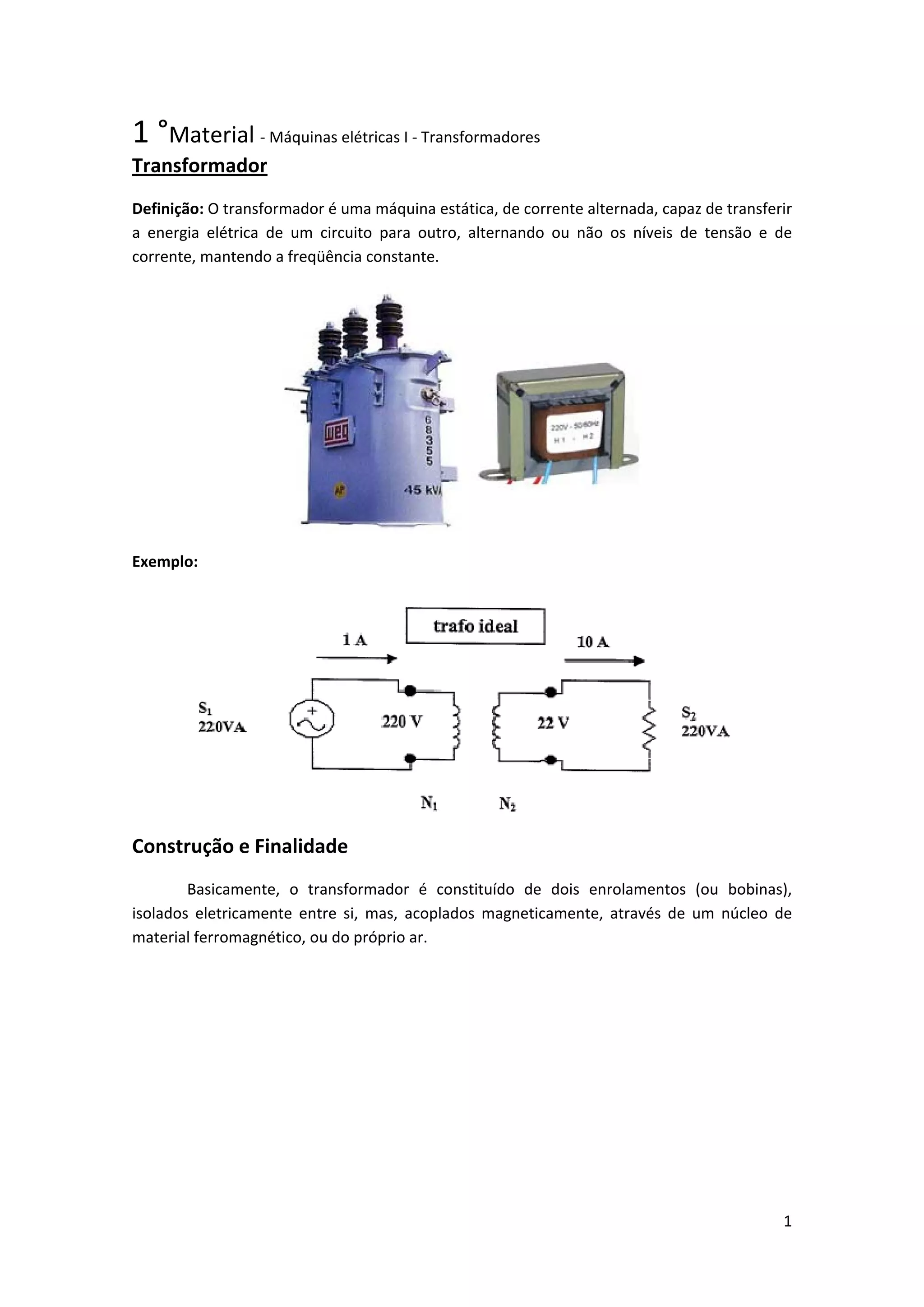 O documento descreve o funcionamento e características básicas dos transformadores. Um transformador é uma máquina elétrica que transfere energia entre dois circuitos, podendo elevar ou reduzir tensões e correntes mantendo a frequência constante. É constituído por dois enrolamentos isolados magneticamente acoplados, e pode ser usado para adequar níveis de tensão e corrente ou isolar circuitos.