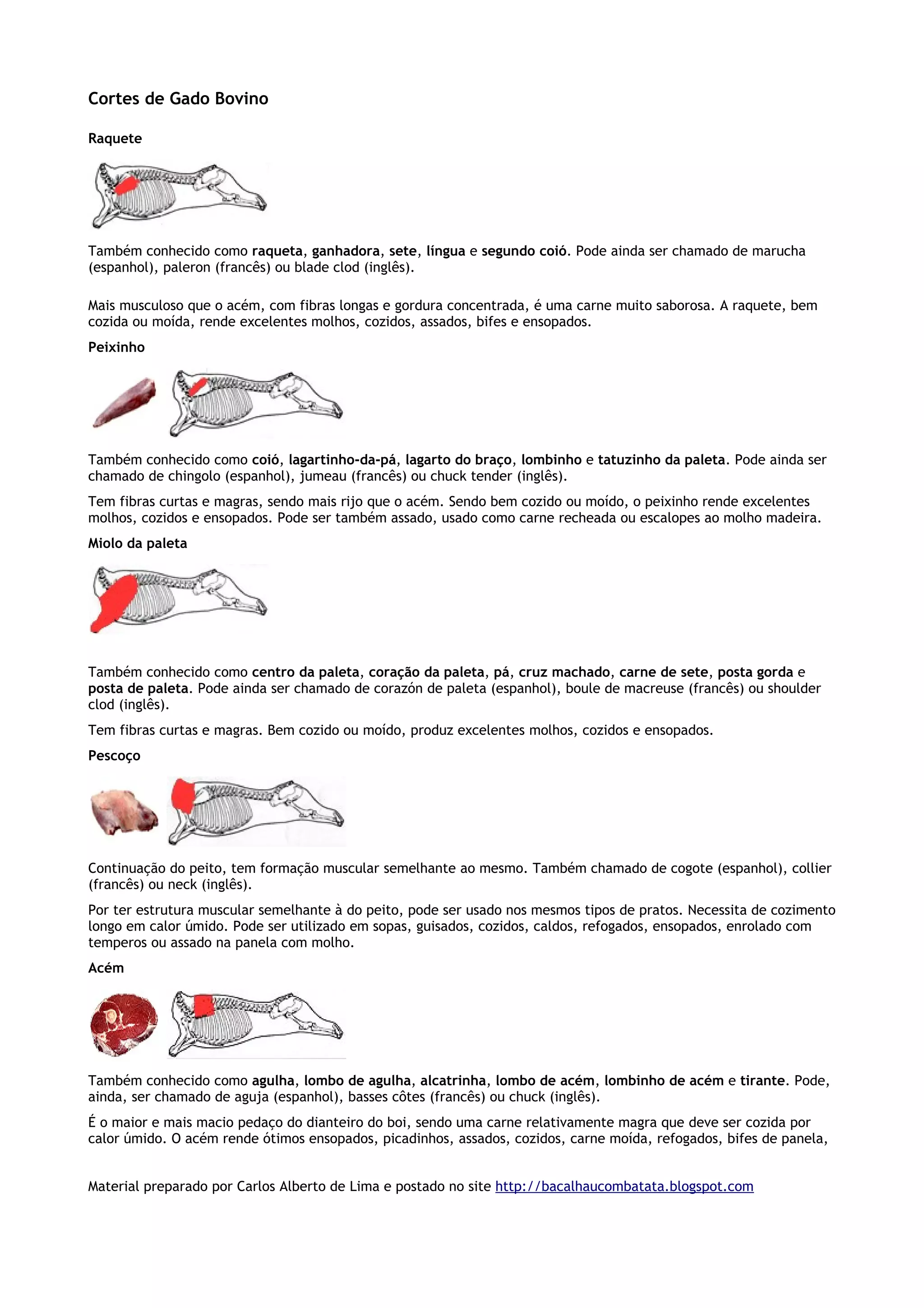 O documento descreve os principais cortes de carne bovina, incluindo nome popular em português e outros idiomas. São detalhadas as características de cada corte como textura, gordura e melhores métodos de preparo como cozimento, assado ou churrasco. Os cortes incluem acém, contra filé, filé mignon, alcatra e picanha.