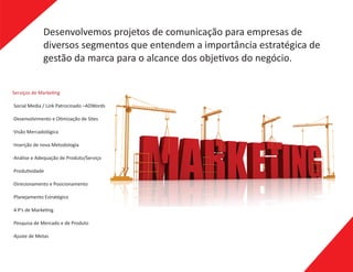 A 4UP Consulting oferece serviços de marketing e comunicação, incluindo desenvolvimento de sites, mídia social, pesquisa de mercado e produto, planejamento estratégico e aumento da produtividade. A empresa ajuda outras organizações a melhorar sua marca e alcançar objetivos de negócio por meio de estratégias e ações criativas de marketing.
