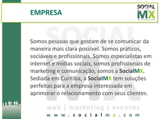 Este documento fornece informações sobre os serviços e valores da empresa SocialMX, especializada em marketing digital. Em resumo: