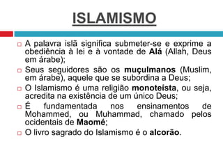 O documento resume as principais características do Islã, Judaísmo, Budismo. O Islã acredita em Alá e Maomé, com cinco pilares como a oração e o jejum. Os muçulmanos se dividem em Sunitas e Xiitas. O Judaísmo tem origem com Abraão e o Torá como livro sagrado. O Budismo tem como fundador Sidarta Gautama e ensina a reencarnação guiada pelo carma até alcançar a nirvana.