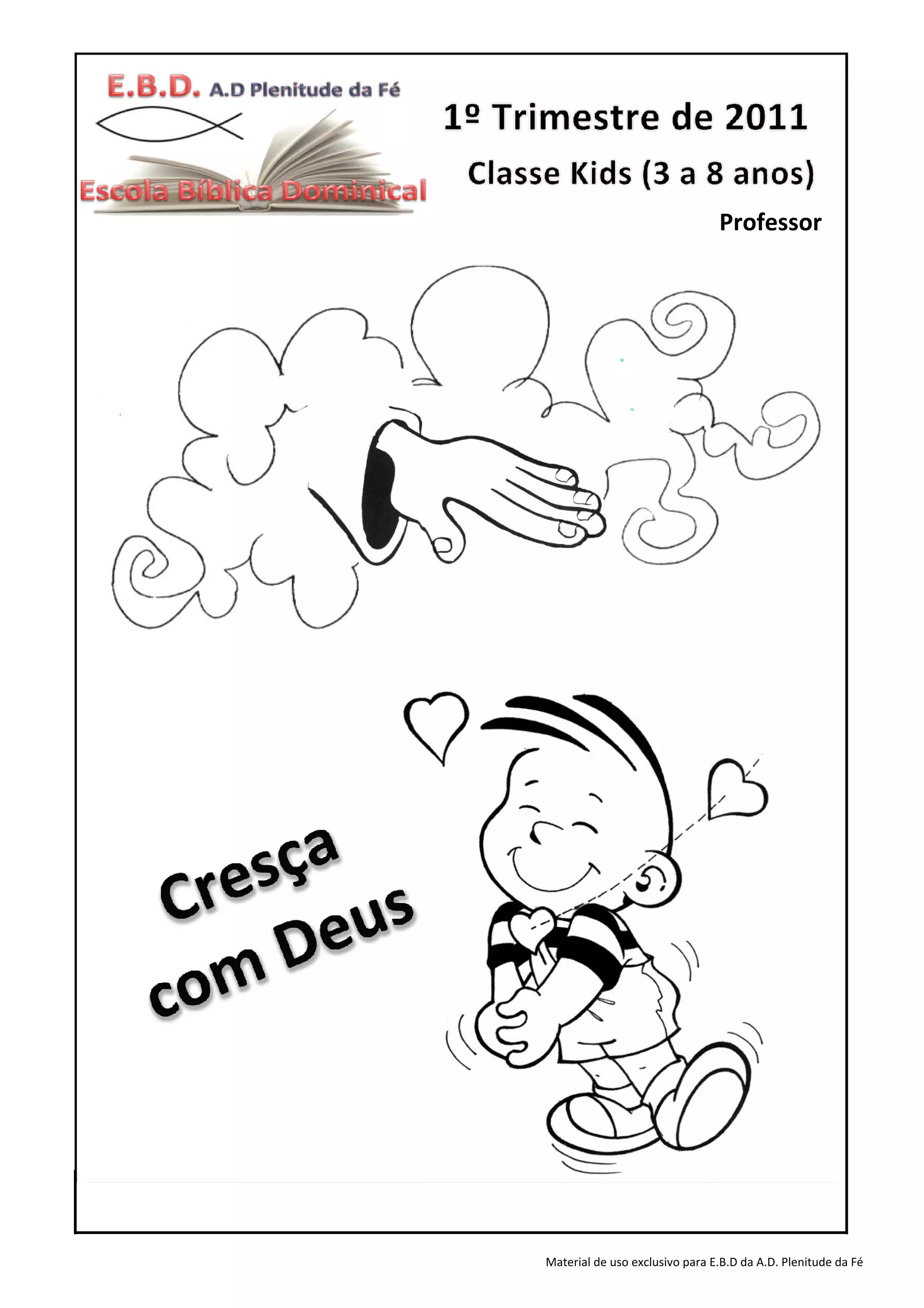 O documento fornece diretrizes para um professor de uma classe de crianças (3 a 8 anos) no primeiro trimestre de 2011. Ele inclui sugestões para 6 lições com temas bíblicos, atividades, versículos para decorar, louvores, brincadeiras e orações.