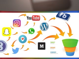 O documento fornece dicas e estratégias para o uso de novas mídias como Instagram, Facebook, YouTube, WhatsApp e outras para fins de marketing digital. Apresenta como construir uma presença nessas plataformas, produzir conteúdo relevante, atrair seguidores e transformá-los em leads e clientes. Também discute o uso de influenciadores digitais e anúncios pagos nessas redes para impulsionar negócios.