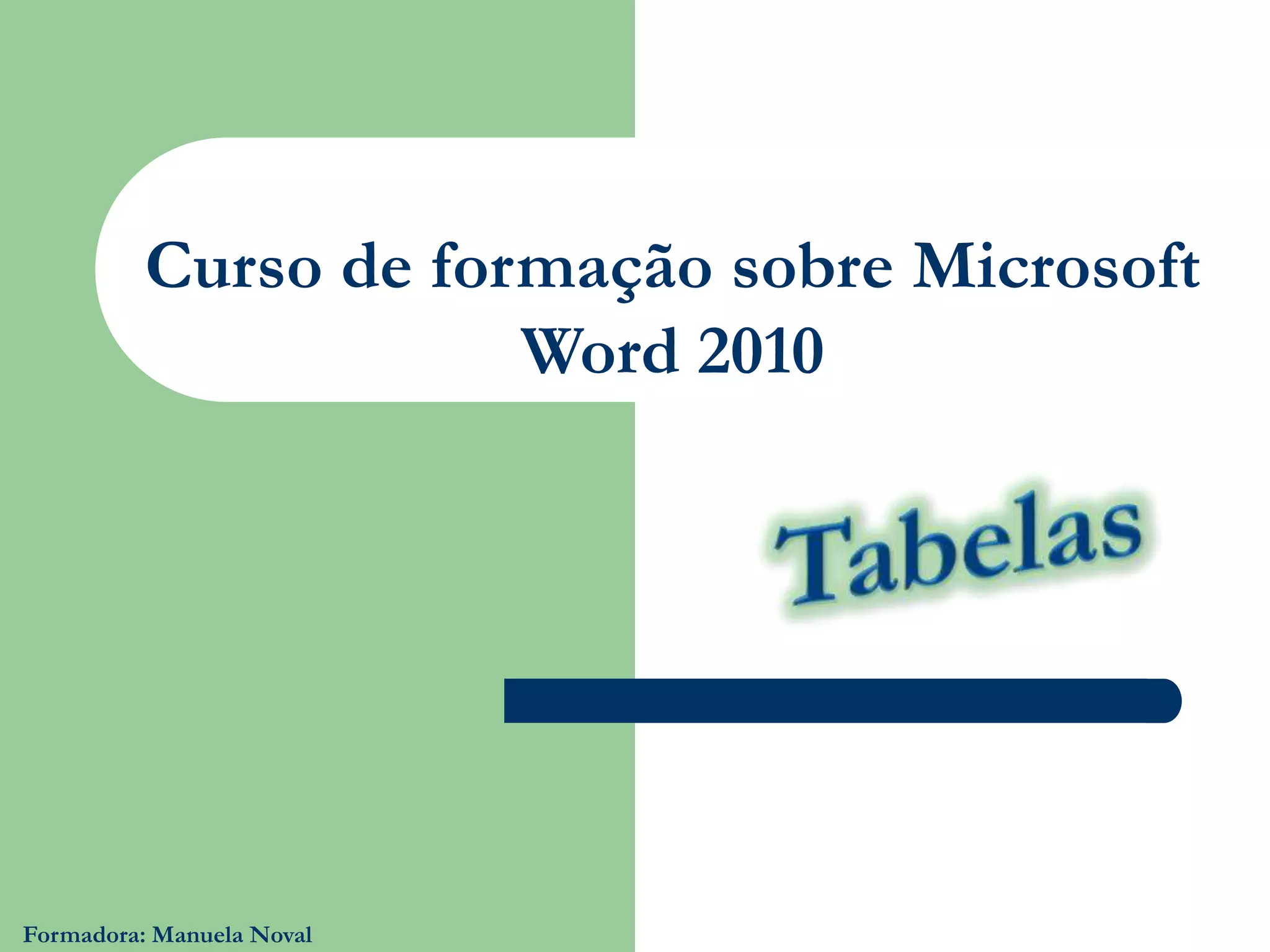 Este documento fornece instruções sobre como usar tabelas no Microsoft Word 2010, incluindo como inserir, formatar, editar e ordenar conteúdo em tabelas. Também apresenta os objetivos da aula e inclui uma demonstração prática e uma ficha de trabalho.