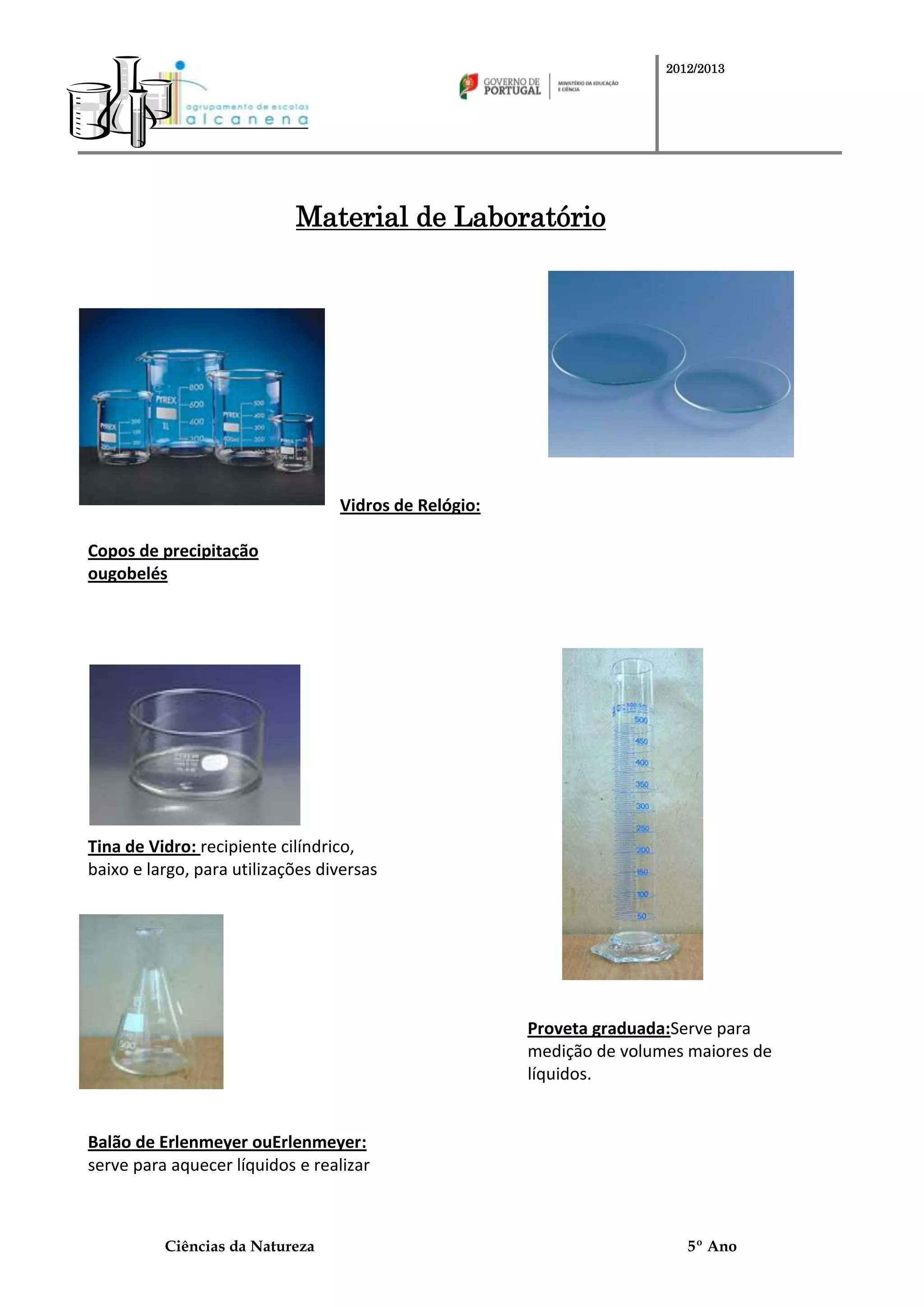 Este documento descreve vários materiais de laboratório, incluindo vidros de relógio, provetas graduadas, balões de Erlenmeyer, tubos de ensaio, almofarizes e suas funções. Também fornece instruções sobre como usar uma lamparina de álcool de forma segura.