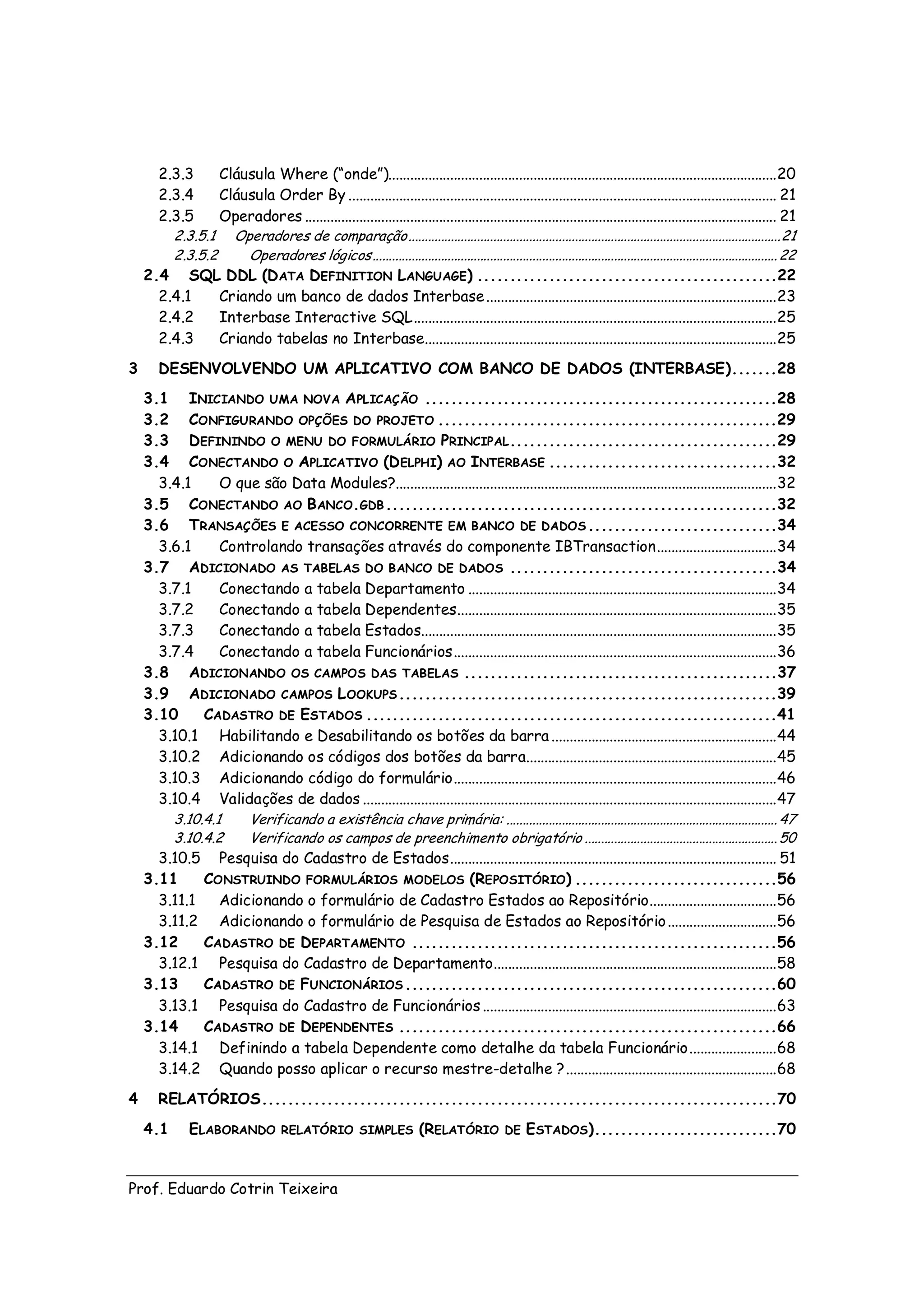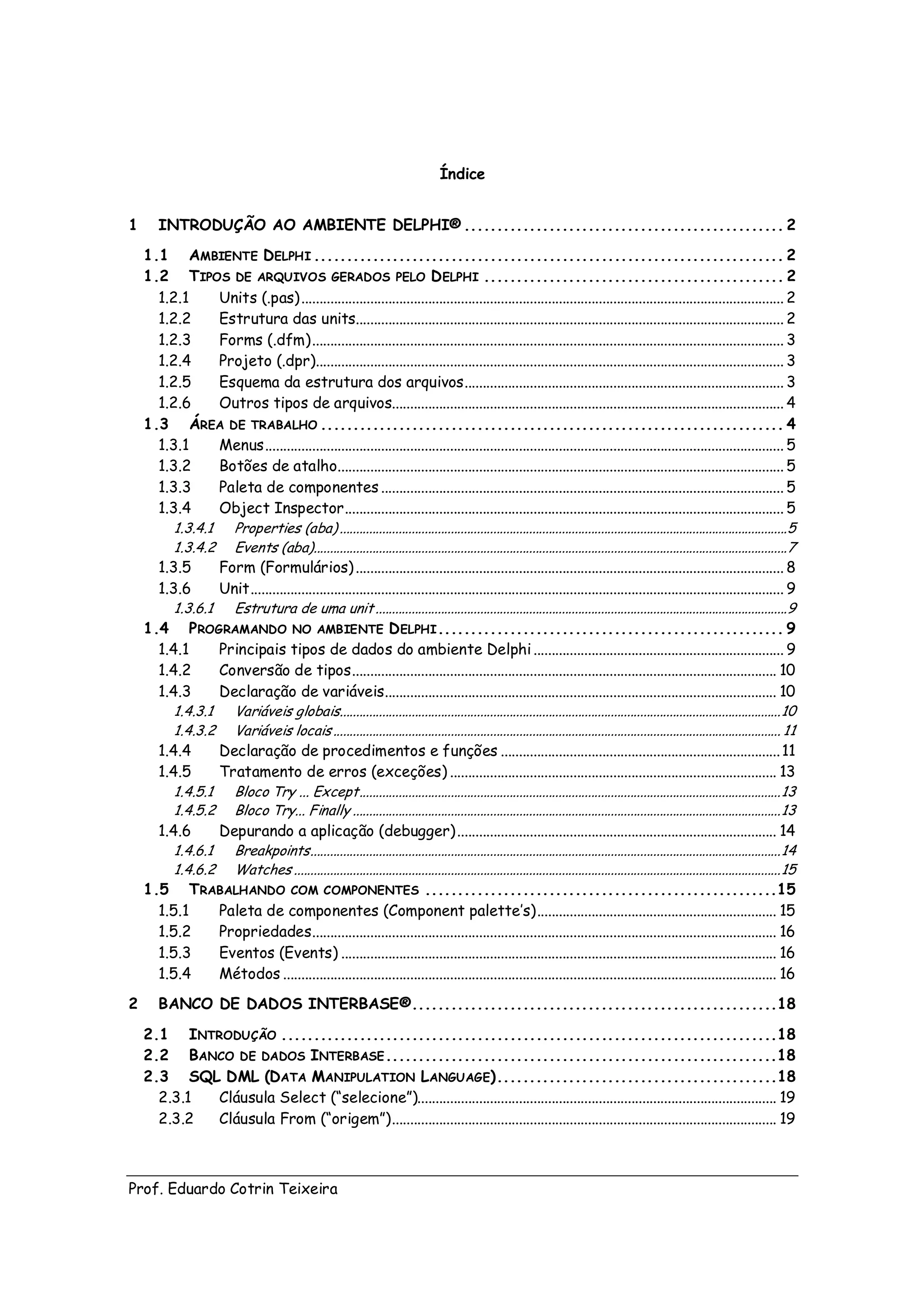 Este documento resume os principais conceitos do ambiente Delphi, incluindo os tipos de arquivos gerados como units e forms, a estrutura da área de trabalho com menus, paleta de componentes e Object Inspector, e conceitos básicos de programação como variáveis, procedimentos, funções e tratamento de erros. O documento também apresenta conceitos básicos de bancos de dados Interbase e SQL.