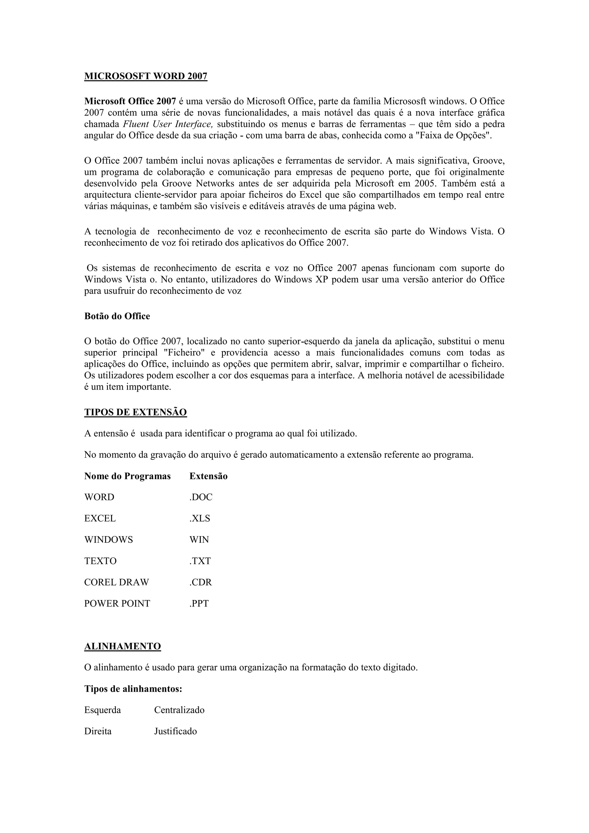 O documento descreve o Microsoft Word 2007, incluindo sua interface gráfica renovada com uma barra de abas chamada "Faixa de Opções" e novas aplicações como o Groove. Também discute as diferenças entre o reconhecimento de voz no Word 2007 e Windows Vista.