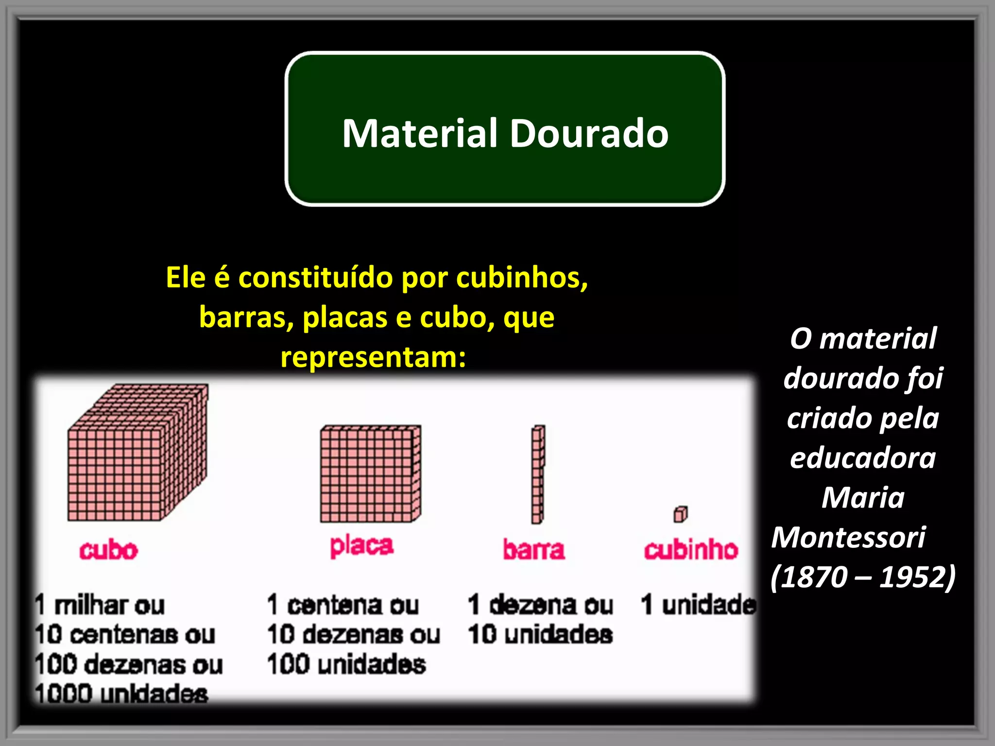O material douradofoi criado pela educadora Maria Montessori (1870 – 1952) Ele é constituído por cubinhos, barras, placas e cubo, que representam: Material Dourado