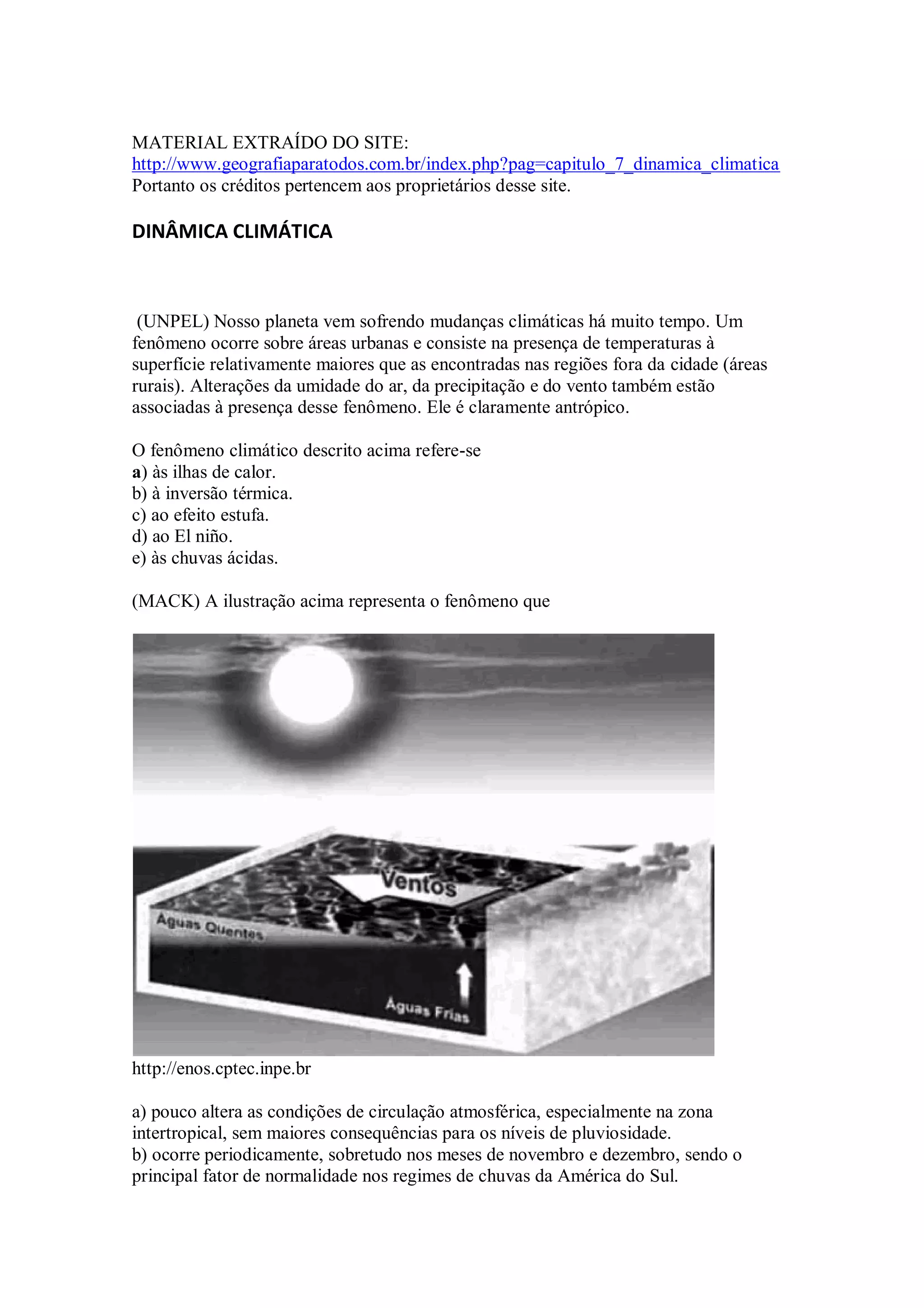 O documento discute a dinâmica climática e apresenta diversos exemplos de fenômenos climáticos, como ilhas de calor, El Niño, massas de ar, entre outros.