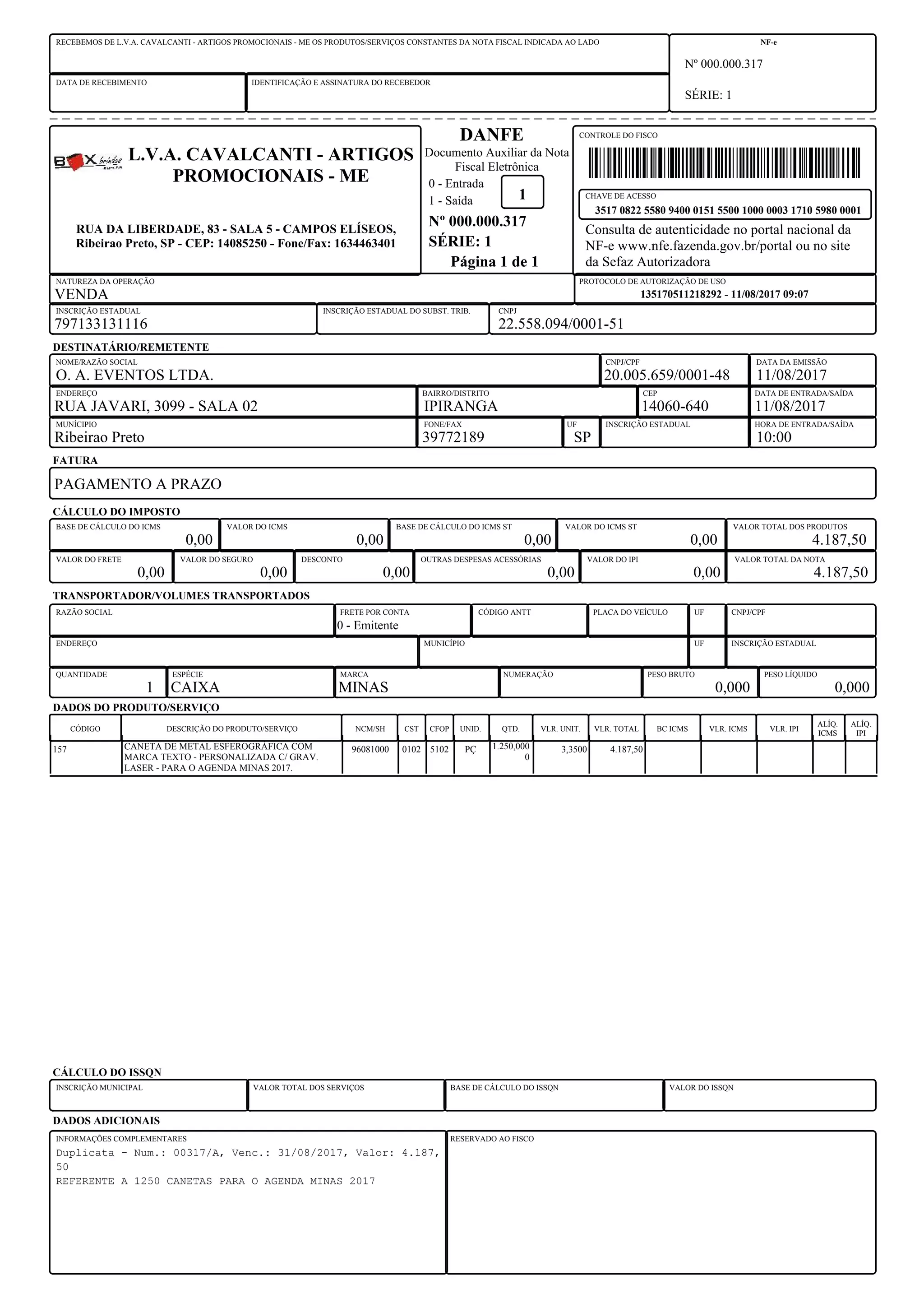 Duplicata - Num.: 00317/A, Venc.: 31/08/2017, Valor: 4.187,