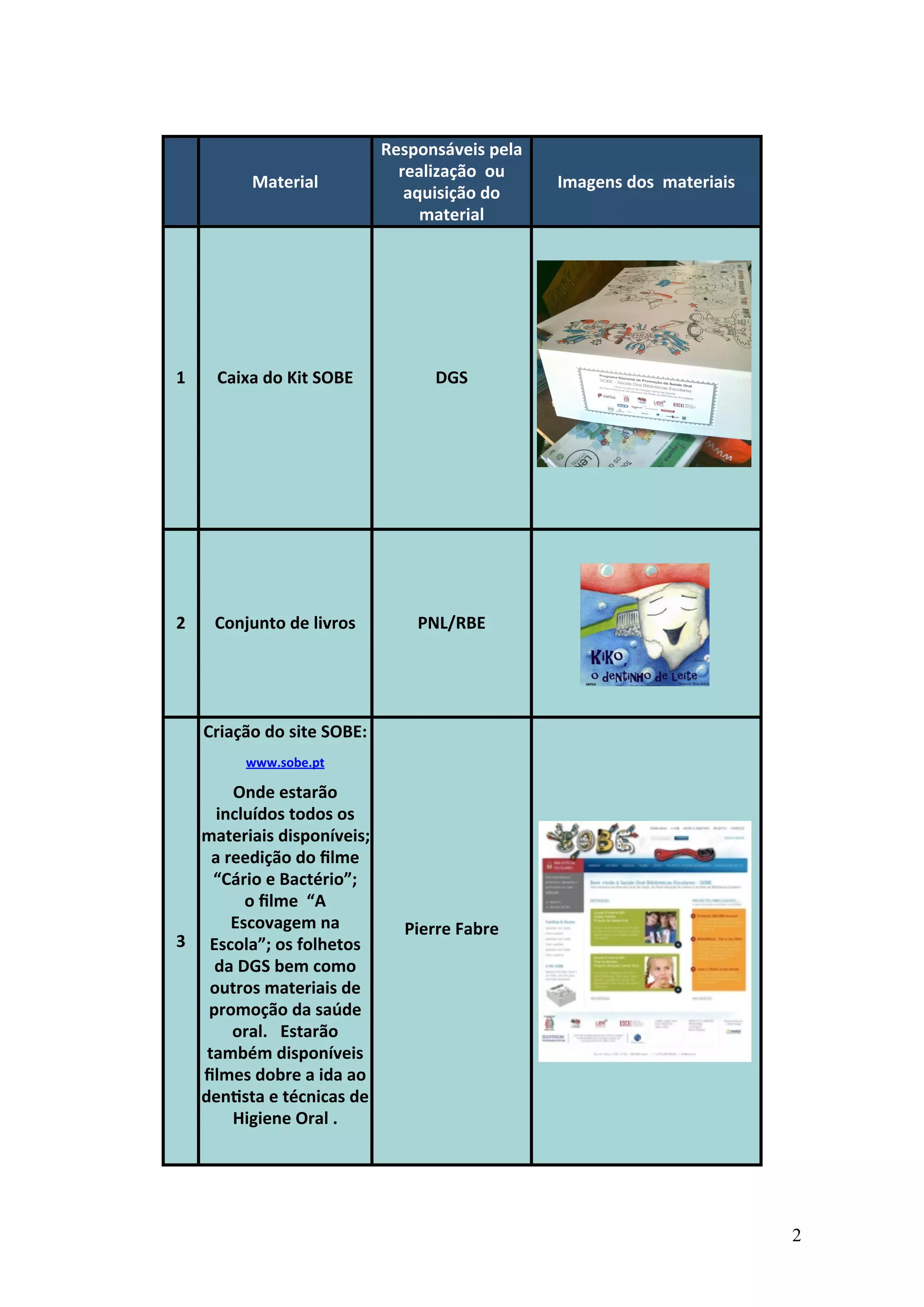 1) O documento lista vários materiais e recursos que serão disponibilizados no site SOBE.pt para promover a saúde oral nas escolas, incluindo livros, filmes, jogos e kits de escovagem.