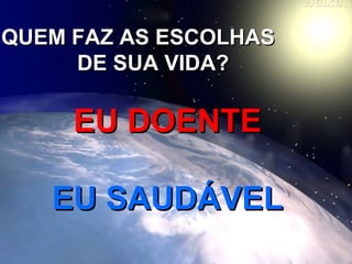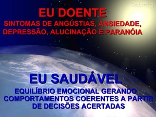 O documento contrasta entre um "eu doente" e um "eu saudável", descrevendo as características de cada um. O "eu doente" é passivo, negativo, crítico, vítima, enquanto o "eu saudável" é determinado, positivo, capaz de reconhecer erros e mudar comportamentos. No final, é creditado a psicólogos clínicos Dra. Sumaia Cabrera e Farhate Bolini.