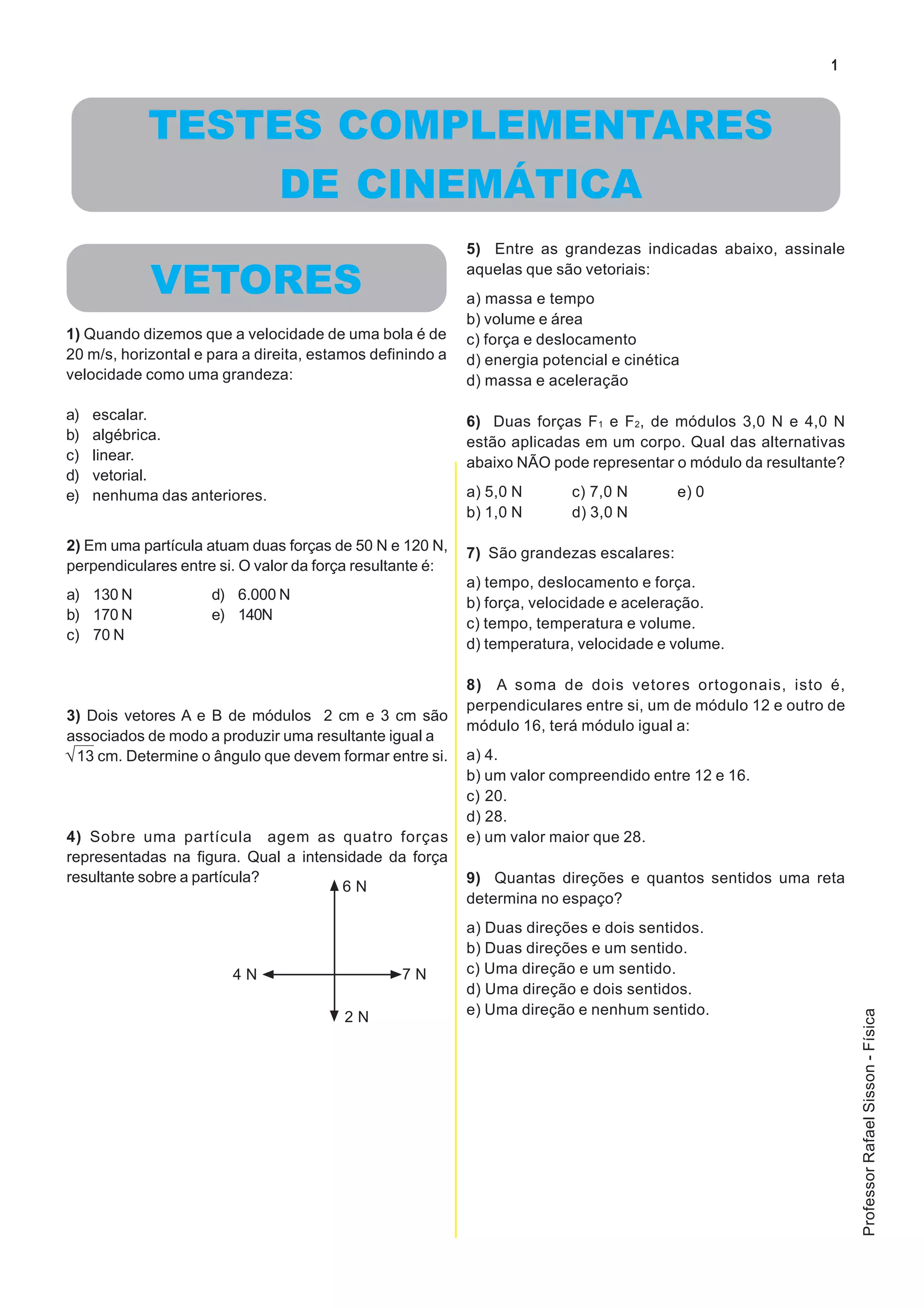 O documento trata de conceitos fundamentais de cinemática vetorial, como forças, velocidades e deslocamentos representados como vetores. Ele aborda propriedades como módulo, direção e sentido de vetores, além de operações como soma e decomposição vetorial. Há 20 questões de múltipla escolha sobre esses tópicos, como cálculo de forças resultantes, componentes de vetores e operações entre grandezas vetoriais.