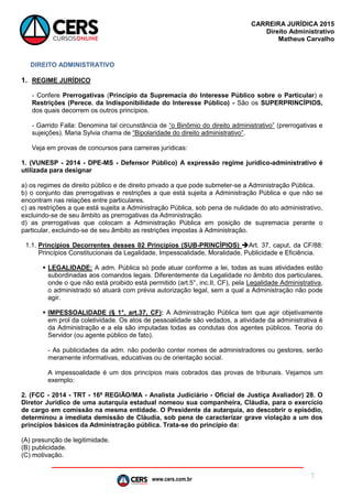 O documento discute os principais aspectos do Direito Administrativo brasileiro, incluindo o regime jurídico da administração pública, os princípios constitucionais da administração e outros princípios como legalidade, impessoalidade e moralidade. Também aborda questões como a presunção de legitimidade dos atos administrativos, o princípio da motivação e o princípio da proporcionalidade.