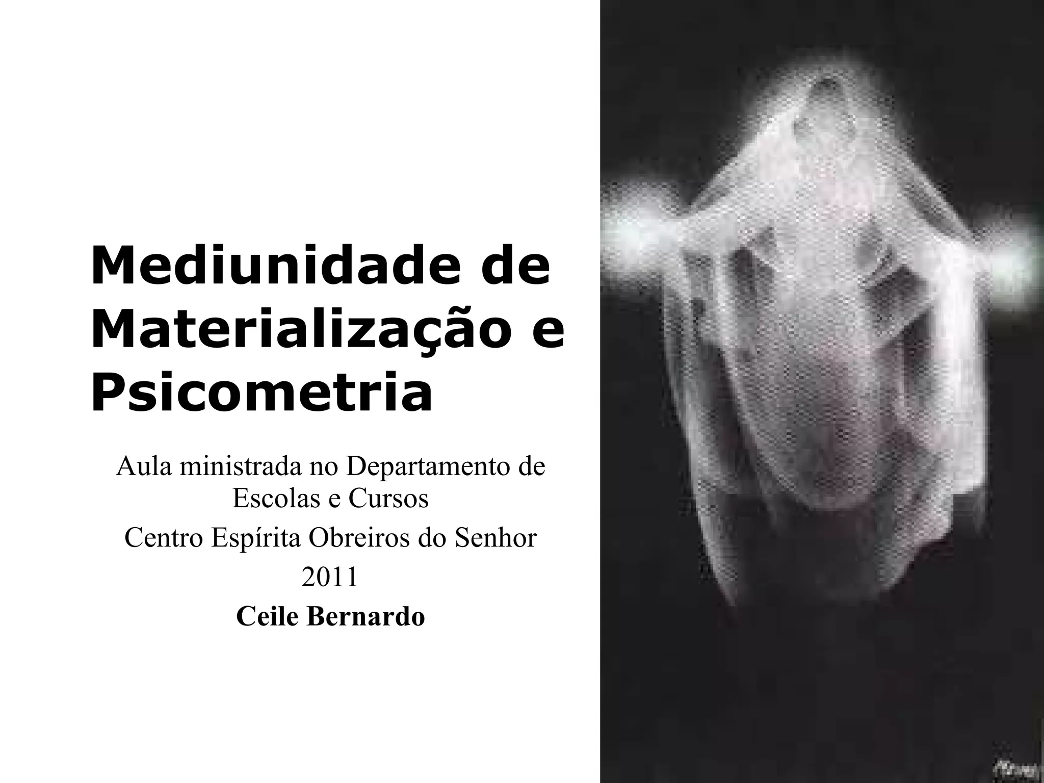 O documento discute diferentes tipos de mediunidade, incluindo efeitos físicos e inteligentes. Detalha fenômenos como materialização, psicometria, voz direta e escrita direta. Também explica o que é ectoplasma, como é produzido e os tipos de ectoplasma. Finalmente, menciona alguns médiuns e pesquisadores famosos associados a esses fenômenos.